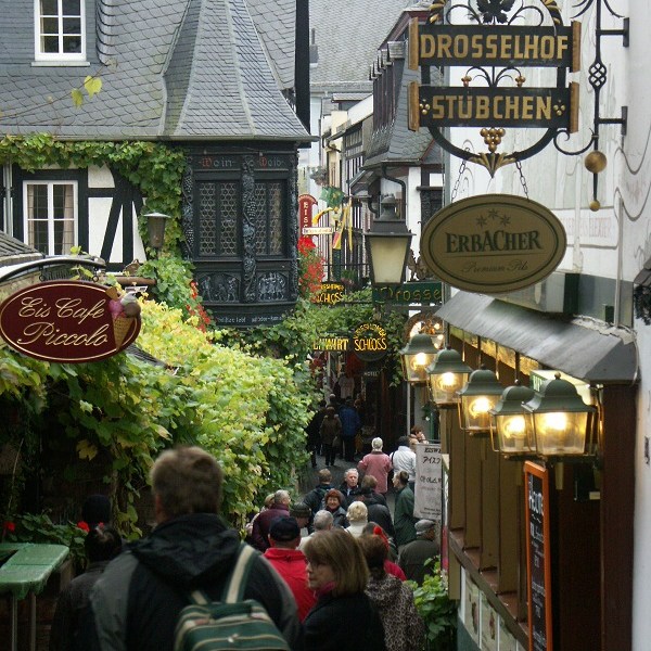 Beim Spaziergang durch den Ort finden wir natürlich auch die Drosselgasse. Dort gibt es einen kleinen Imbiss und zur Krönung einen Rüdesheimer Kaffee.