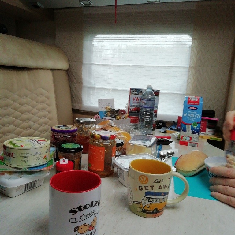 Es ist der 17. November 2018 und wir sind stolze Besitzer eines teilintegrierten Wohnmobils. Schnell nach Hause zum Einräumen. Alles was wir aus dem Pössl im Arbeitszimmer gebunkert haben bekommen wir ganz bequem darin unter. Die Kennenlernreise startet am gleichen Abend und soll uns in den Odenwald führen. Wir werden die herzallerliebste Tante zu einem verspäteten Geburtstagsfrühstück im Schneckenhaus einladen. Die Umgewöhnung auf das Automatikgetriebe ist leichter als gedacht. Das eingebaute Multimedia Center mit NAVI, Radio und Heckkamera überzeugt auf ganzer Linie. Wir brauchen bestimmt noch einige Zeit um alle Funktionen kennenzulernen.