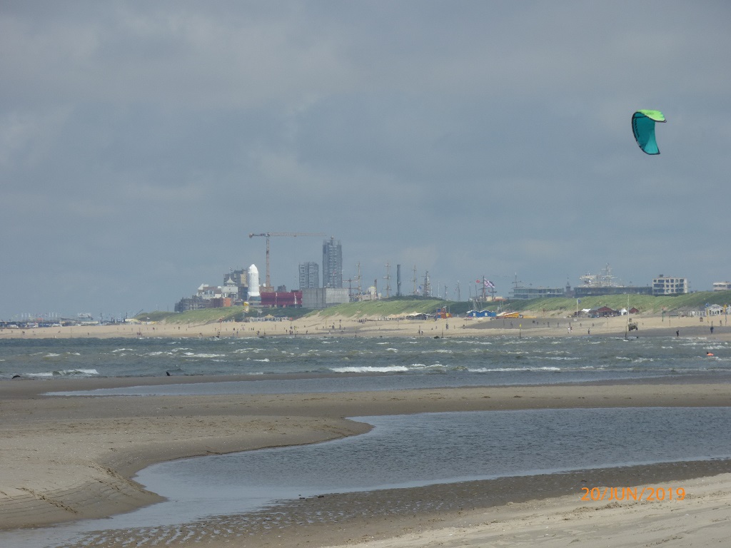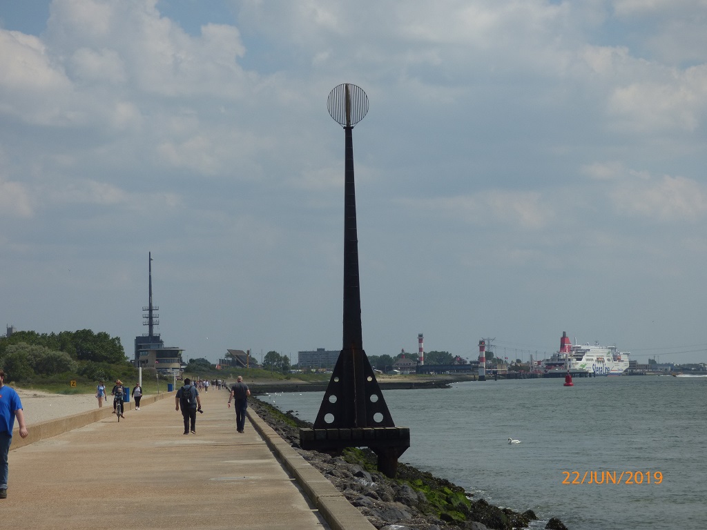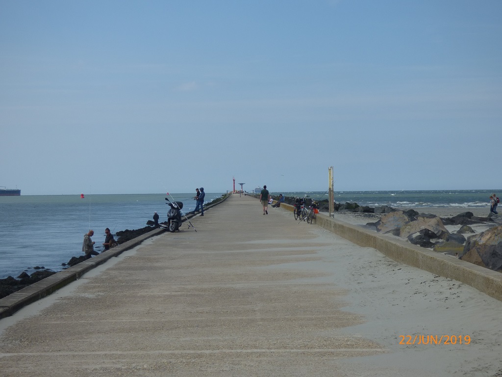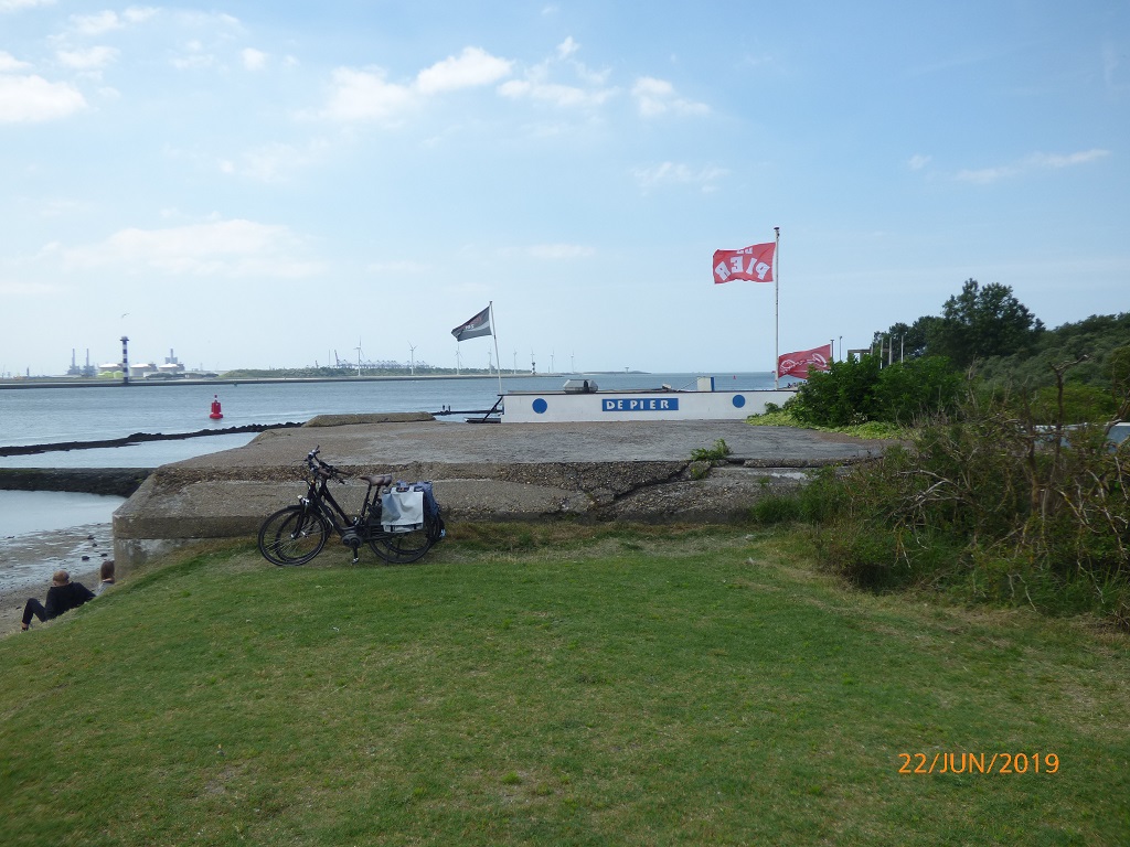 Am nächsten Tag fahren wir deshalb in die entgegengesetzte Richtung, nämlich zum Hoek van Holland. Eine Infobroschüre hat uns neugierig gemacht. Es handelt sich hierbei um eine kleine Küstenstadt, einem Stadtteil von Rotterdam. Des weiteren mündet hier der Rhein in die Nordsee. Das Mündungsdelta wird auch als Einfahrt in den Hafen von Rotterdam genutzt. Der Radweg an der Düne entlang führt uns direkt in den Ort und an den Leuchtturm. Das Städtchen ist nichts besonderes, daher fahren wir weiter zur eigentlichen „Ecke“ von Holland. Am Kiosk „De Pier“ stellen wir die Räder ab und laufen an und auf dem Kai entlang zur Mündung.