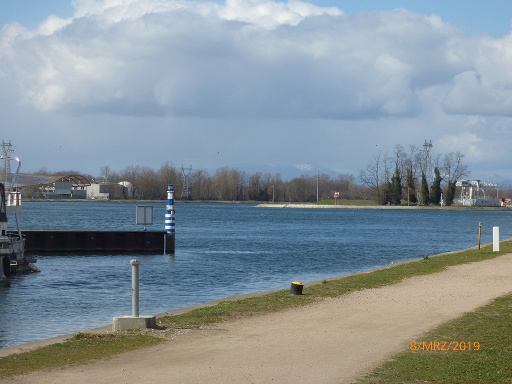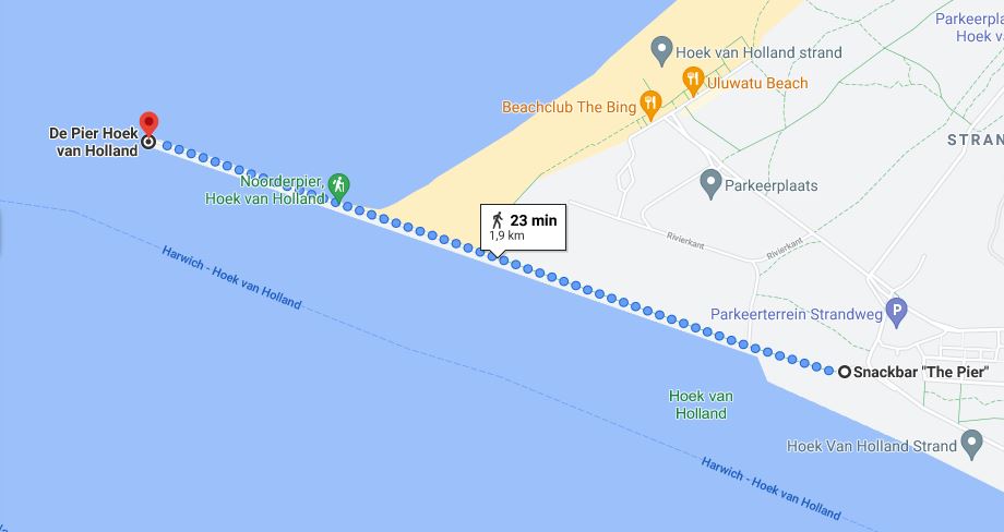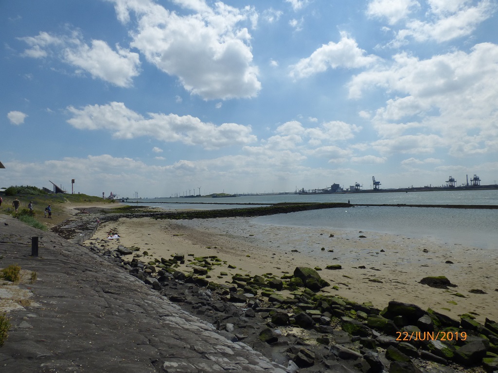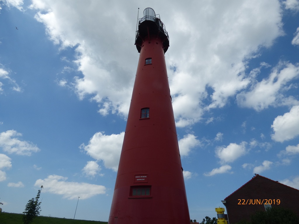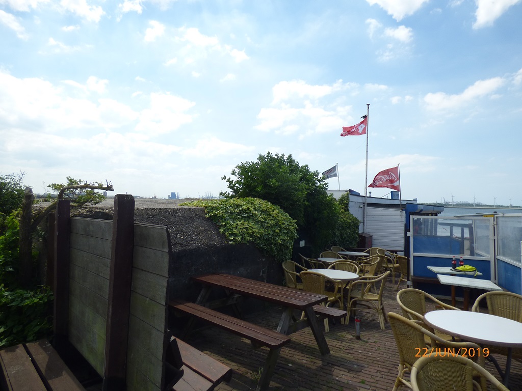 Am nächsten Tag fahren wir deshalb in die entgegengesetzte Richtung, nämlich zum Hoek van Holland. Eine Infobroschüre hat uns neugierig gemacht. Es handelt sich hierbei um eine kleine Küstenstadt, einem Stadtteil von Rotterdam. Des weiteren mündet hier der Rhein in die Nordsee. Das Mündungsdelta wird auch als Einfahrt in den Hafen von Rotterdam genutzt. Der Radweg an der Düne entlang führt uns direkt in den Ort und an den Leuchtturm. Das Städtchen ist nichts besonderes, daher fahren wir weiter zur eigentlichen „Ecke“ von Holland. Am Kiosk „De Pier“ stellen wir die Räder ab und laufen an und auf dem Kai entlang zur Mündung.