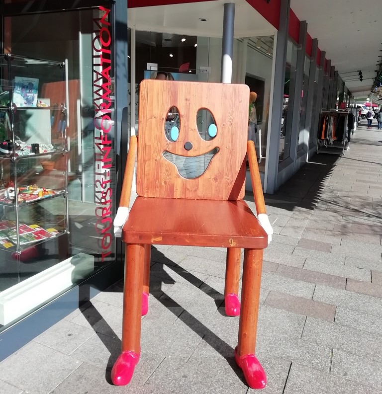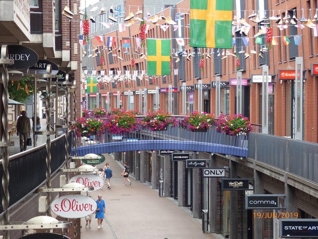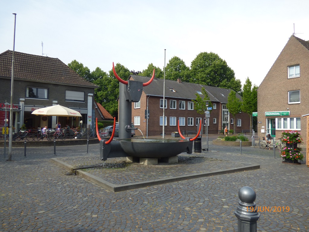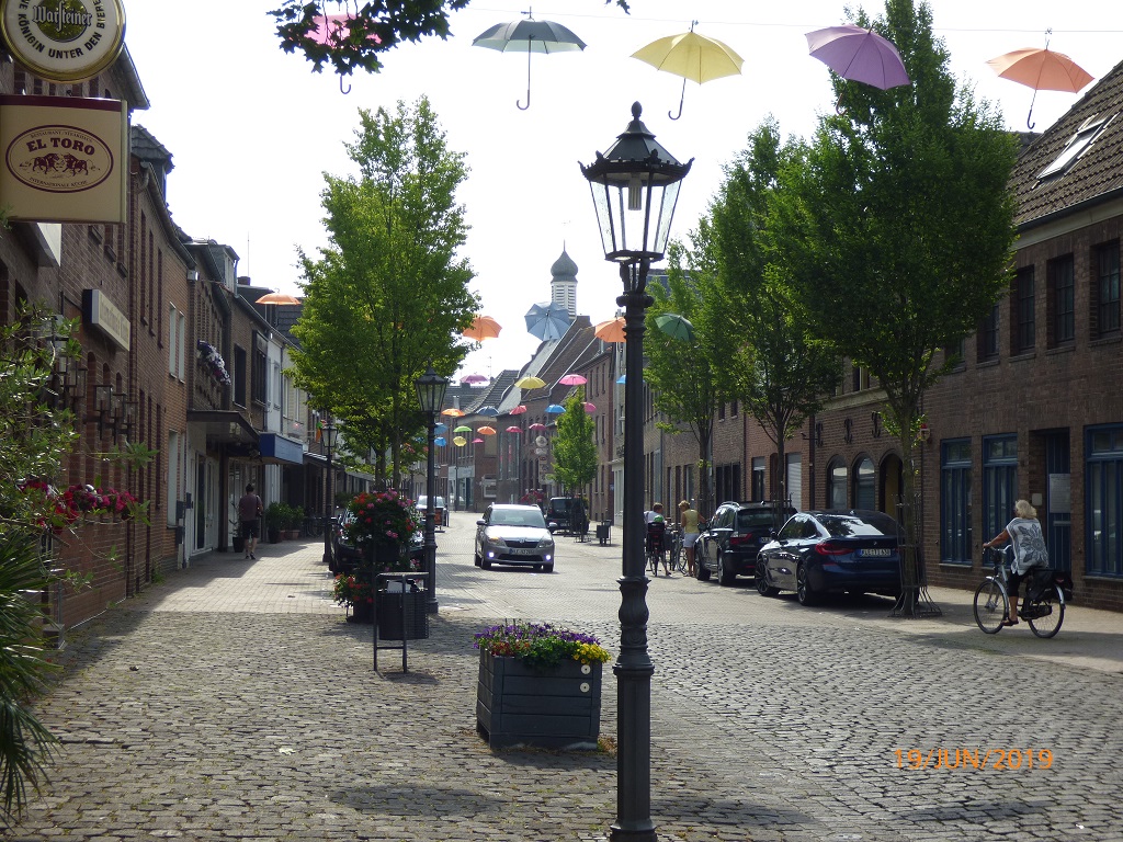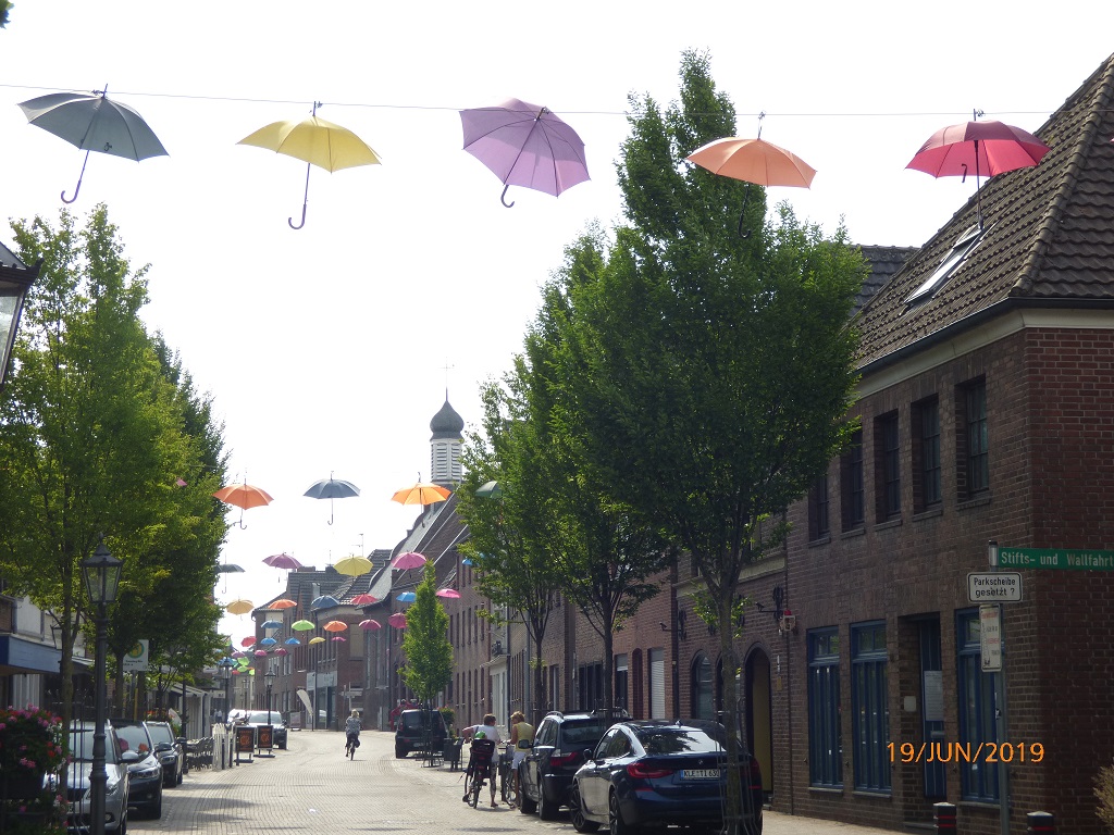 Aber ohne Mampf kein Kampf. Vom Industriegebiet aus radeln wir direkt zur Bäckerei Derks am Marktplatz, wie es uns Google vorschlägt. Zuvor noch ein wenig Bargeld für den Tag. Die Regenschirme kennzeichnen die Einkaufsstraße, dort finden wir den Bankomaten und haben Glück, die Läden sind noch zu.