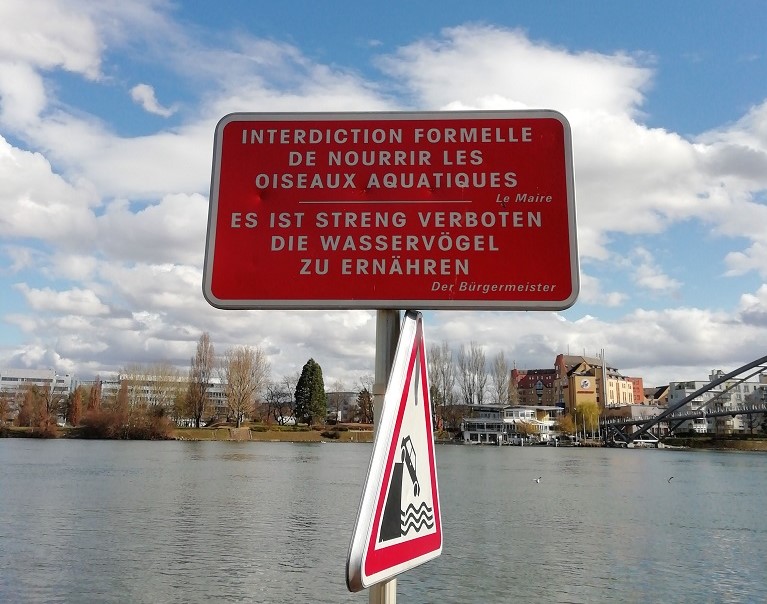 Kurzer Rundgang in Weil am Rhein und dann am Dreiländereck über die Brücke auf die französische Seite des Rhein. Hier werden keine Schwäne gefüttert sondern Wasservögel ernährt.