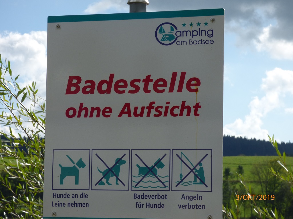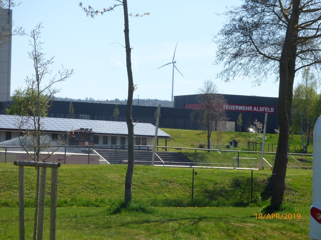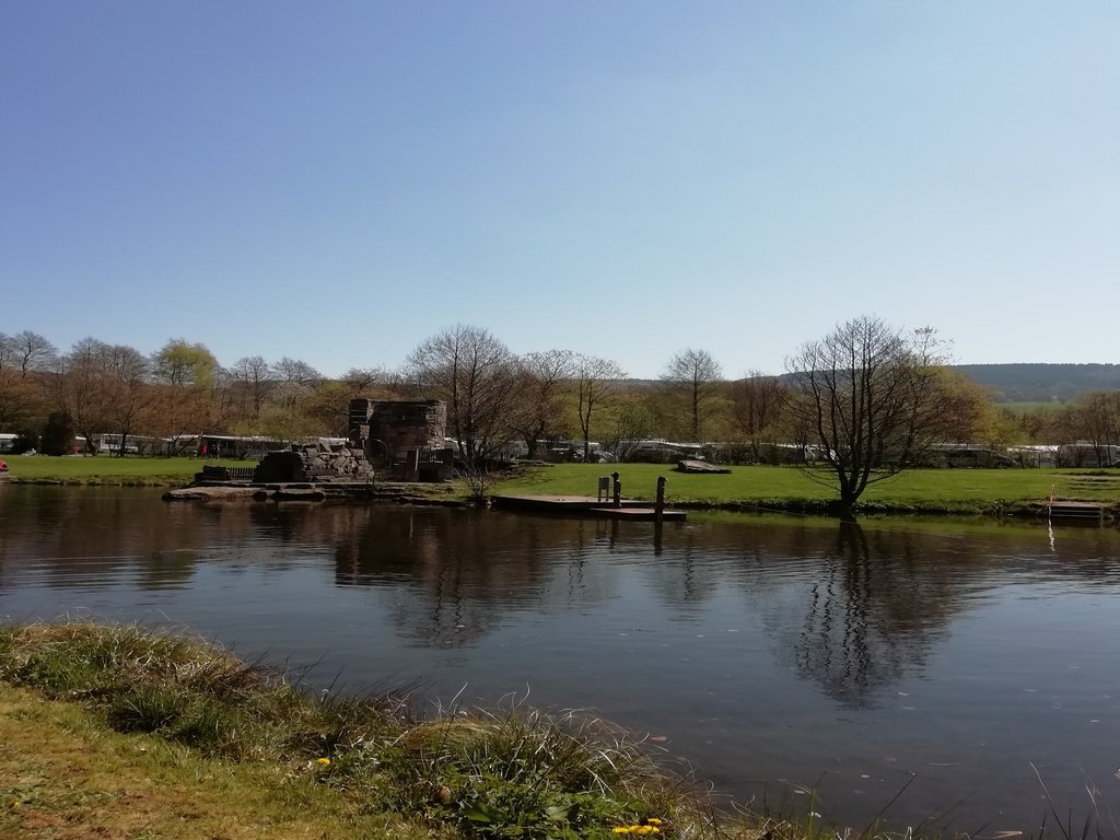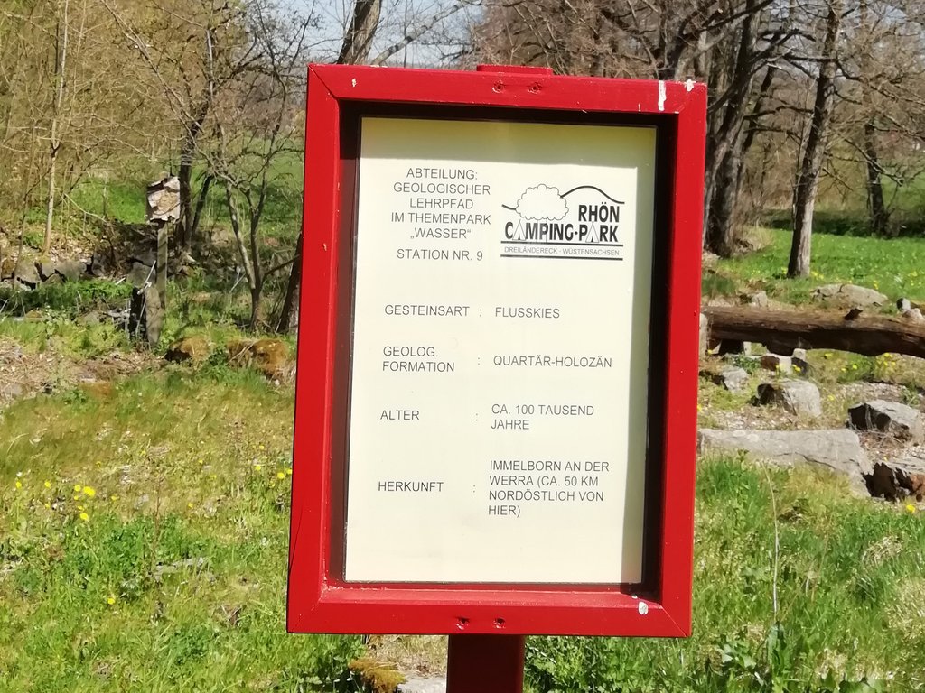 Es geht wieder in die Gegenwart zum Stellplatz beim Erlenstadion und weiter in Richtung Rhön-Camping. Der Campingplatz überrascht uns positiv. Er ist wirklich schön angelegt und direkt an einem Bach gelegen. Ein kleiner Badesee mit Ritterburg ist ein idealer Kinderspielplatz und für besonders Wissbegierige gibt es einen Gesteinslehrpfad.