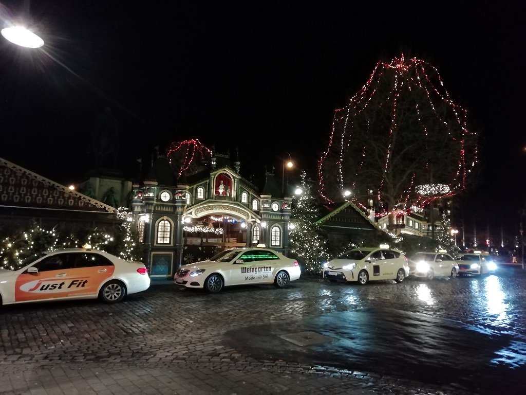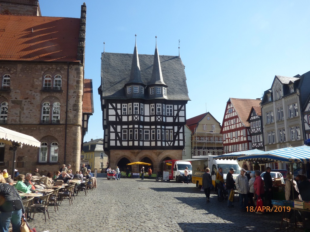 Beim Rundgang am Abend waren die Bürgersteige hochgeklappt und die Straßenlaternen auf Sparflamme gestellt. Bei Sonnenschein strahlt die Altstadt und es herrscht reger Betrieb. Das Rathaus ist sehr berühmt, vor allem bei Bastlern. Die Firma Kibri bietet nämlich einen Bausatz für die Modelleisenbahn Spur H0 an.