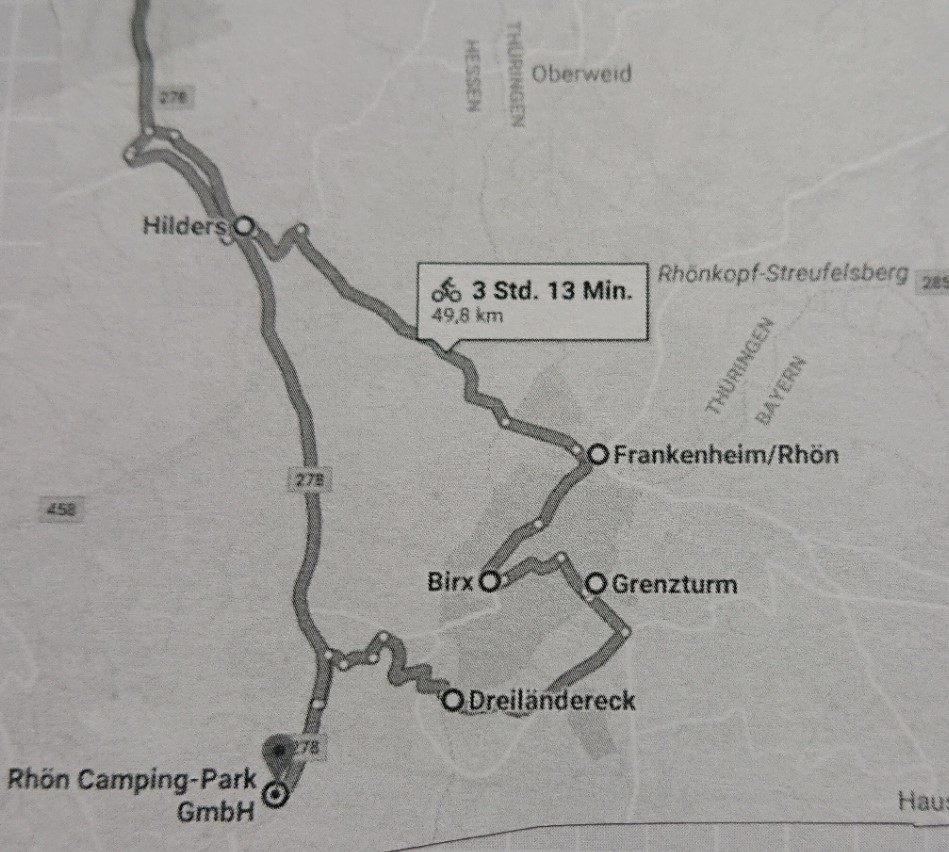 Schon zuhause habe ich mit Google Maps eine Radtour ausgearbeitet. In der Theorie sieht das ganz gut aus. In der Praxis nehmen wir den Plan aber eher als Vorschlag. Nach den ersten schweren Steigungen kürzen wir die Strecke indem wir den Schlenker nach Hilders und Tann auslassen. Die Klettertour nach Frankenheim, der höchstgelegenen Stadt in der Rhön, hat einige Körner gekostet. Die anderen Ziele sind dahin gehend sehr einfach zu erreichen.