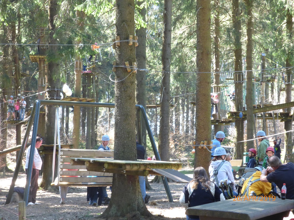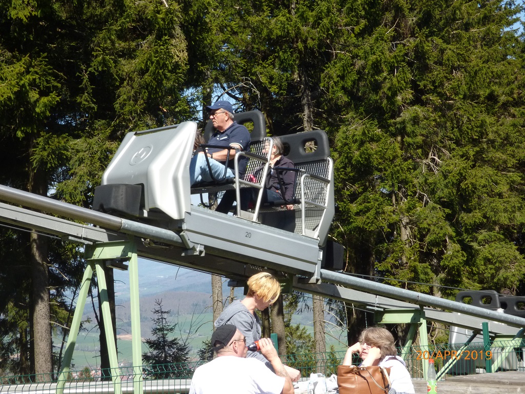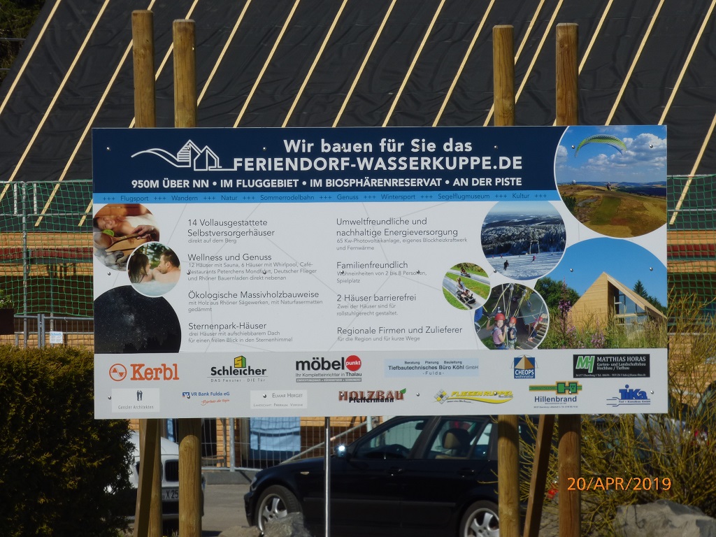 Für Samstag ist in der Theorie eine weitere Radtour vorgesehen. Die gestrigen Erfahrungen, die strapazierten Muskeln und Hinterteile sprechen aber gegen eine praktische Umsetzung….. Nach dem ausgiebigen Frühstück kurbeln wir die Markise ein, blockieren unseren Platz mit Tisch und Stühlen. Die Räder binden wir fest, die brauchen wir heute nicht. Erste Station ist die Wasserkuppe, das Mekka der Segelflieger und im Winter natürlich auch ein tolles Schneegebiet. Zu Zeiten des BGS haben wir den Dienstsport hierher verlagert und es mit Langlauf versucht. Hier oben gibt es weitere Attraktionen wie die Sommerrodelbahnen und den Hochseilgarten. Bemerkenswert ist der Hinweis auf das im Bau befindliche Feriendorf.