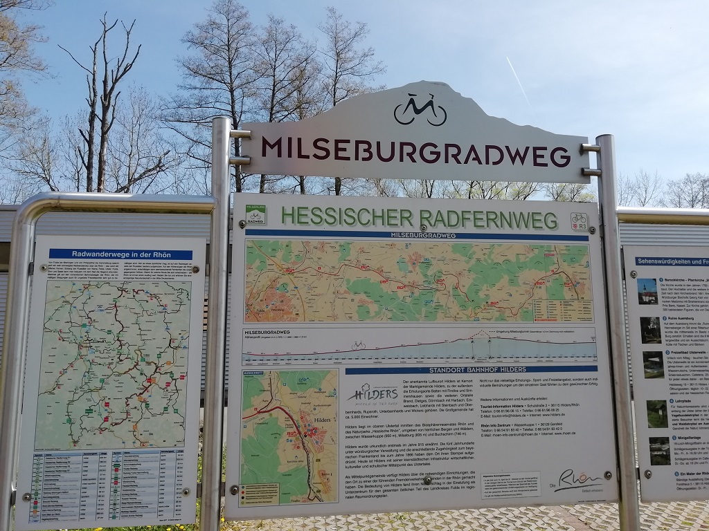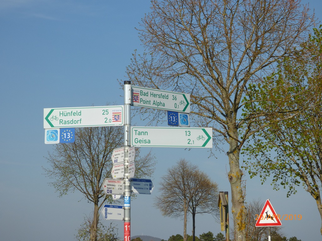 Es wird ein langer Tag. Völlig geschafft kommen wir zum Stellplatz, parken neben unseren Möbel ein und fahren die Markise wieder aus. Jetzt können wir es uns vorm Schneckenhaus gemütlich machen. Den Ostersonntag nutzen wir zur vollständigen Regeneration. Ein kleiner Spaziergang zum Badesee und eine Runde auf dem Gesteinslehrpfad reichen an Bewegung für diesen Tag….. Kraft sparen für die morgige Radtour ist angesagt. Bei der ersten Tour hatten wir ja abgekürzt und Hilders sowie Tann ausgelassen. Diese Strecke soll nun nachgeholt werden. Es geht einen Teil auf dem Milseburgradweg entlang. In Hilders bewundern wir den Garten des neu gestalteten Bahnhofgebäudes und vor allem das Klingelschild. In Tann gönnen wir uns endlich einmal ein Gedeck, also Spaghettieis und Latte Macchiato. Das Städtchen ist uns von unserer Radtour im Jahr 2008 bekannt.