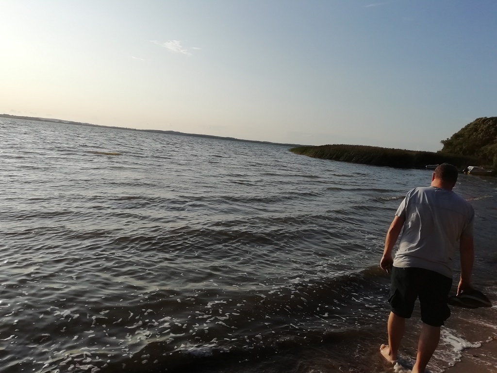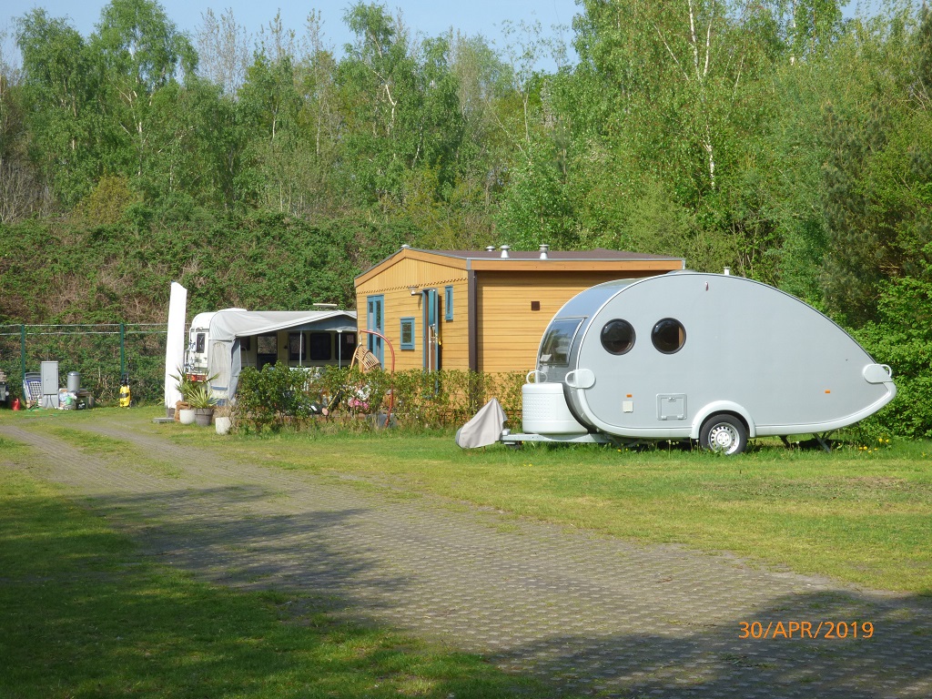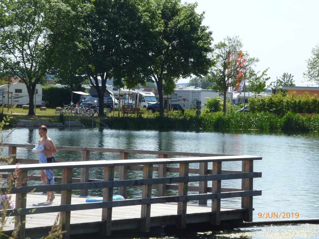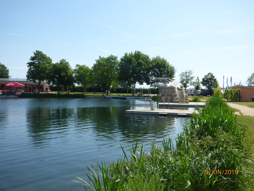 Mein Interesse ist befriedigt sobald wir im Empfangsbereich stehen. Das Tropenhaus in der Stuttgarter Wilhelma hat ein angenehmeres Klima. Es ist eben doch nur ein riesiges Hallenbad und daher überhaupt nicht mein Fall. Noch ein paar Aufnahmen v0n der beeindruckenden Stahlkonstruktion und nix wie raus….. Neben der Halle ist ein Feriendorf unter der Verwaltung von Novasol entstanden und etwas weiter entfernt auch ein Campingplatz. Das ehemalige Flugplatzgelände ist sehr weitläufig, vorbei an den alten Bunkeranlagen des Militärgeländes finden wir den Campingplatz am hintersten Ende. Sehr weit weg vom „Schwimmbad“ und irgendwie macht das alles von außen keinen gemütlichen Eindruck. Wir suchen lieber woanders nach einem Übernachtungsplatz. Den finden wir dann auch, mehr oder weniger zufällig am so genannten „Hölzerner See“ und mieten uns für zwei Übernachtungen ein. Die Rezeption im Blick und den großen Bruder von Pompui im Rücken, da kann nichts schief gehen. Der nächste Tag besteht aus chillen, lesen und Tagebuch schreiben. Dazwischen ein ausgedehnter Spaziergang am See entlang. Die Dauercamper haben sich teilweise ganz witzig eingerichtet. Da gibt es kleine Festzelte unter denen dann die Wohnwagen mit Vorzelten eingerichtet sind. Das Zelt im Zelt so zu sagen. Am Ufer sind einige kleine Stege, Einstiege angelegt. Teilweise sogar mit Garderoben um die Badetücher oder Bademäntel aufhängen zu können. Gartenzwerge mussten hier Fröschen weichen.