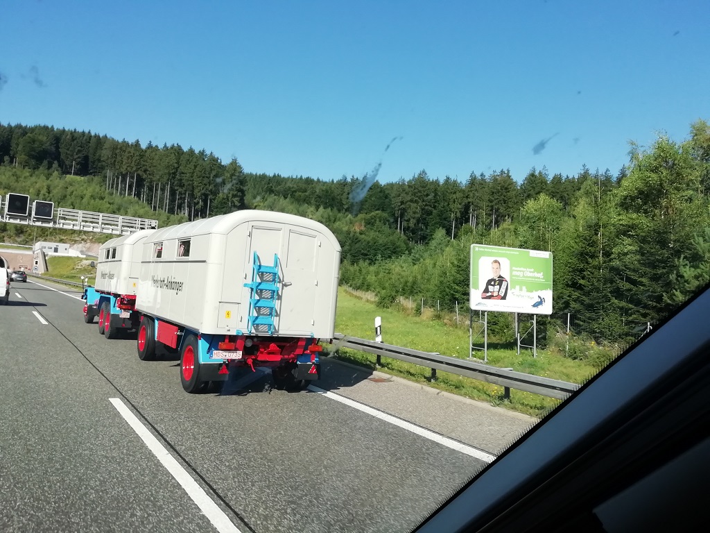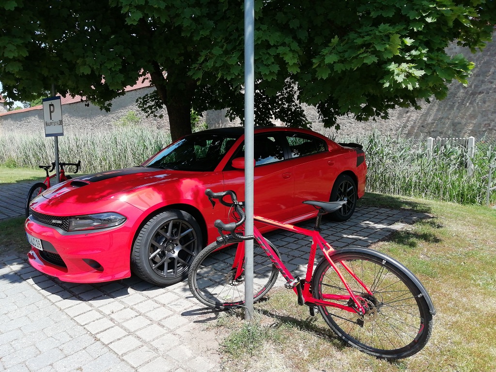 Die letzte Nacht auf der Reise wird im Morgengrauen jäh unterbrochen. Ein extrem lauter Knall, als ob ein Düsenjet die Schallmauer durchbrochen hat und das knapp über unserem Schneckenhaus… Einige der Camper sind schon draußen. Ich nähere mich der Rauchwolke, die am Baum vorm Zaun hochsteigt. Ein 3er BMW ist frontal auf den Baum gekracht. Zwei Personen liegen benommen auf ihren Sitzen. Der Beifahrersitz ist durchgebrochen und dadurch liegt der Beifahrer flach auf dem Rücken. Der Fahrer ist auf seinem Sitz eingeklemmt. Ich laufe zurück und hole zur Sicherheit eine Decke und den Feuerlöscher. Wäre nicht nötig gewesen, denn von gegenüber kommt schon ein Feuerwehrmann mit besserer Ausstattung. Der ist glücklicherweise auf dem Weg zur Arbeit. Die beiden BMW-Insassen kommen wohl gerade aus der Disko und sind zugedröhnt. Sie sind nicht in der Lage einen zusammenhängenden Satz zu formulieren. Da die Polizei uns nicht benötigt und wir eh wach sind fahren wir los. Es ist gerade mal halb sieben….. Das Frühstück wird, wie gestern, vom Füllstand des Tankes abhängig gemacht. Zwischenstopp dann in Werneck. Der Oldtimer Konvoi den wir unterwegs überholen ist uns einige Aufnahmen wert. Am späten Nachmittag können wir endlich unsere Räder wieder im Radständer vorm Haus abstellen.