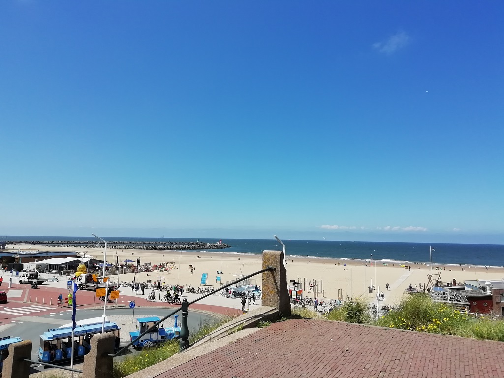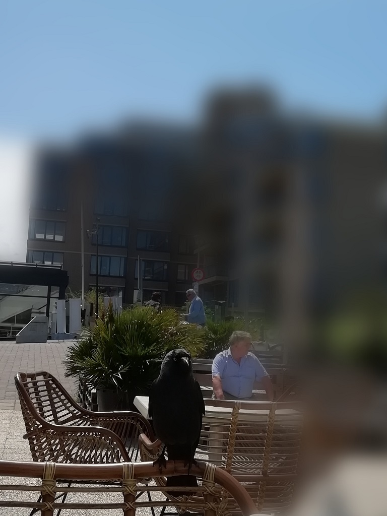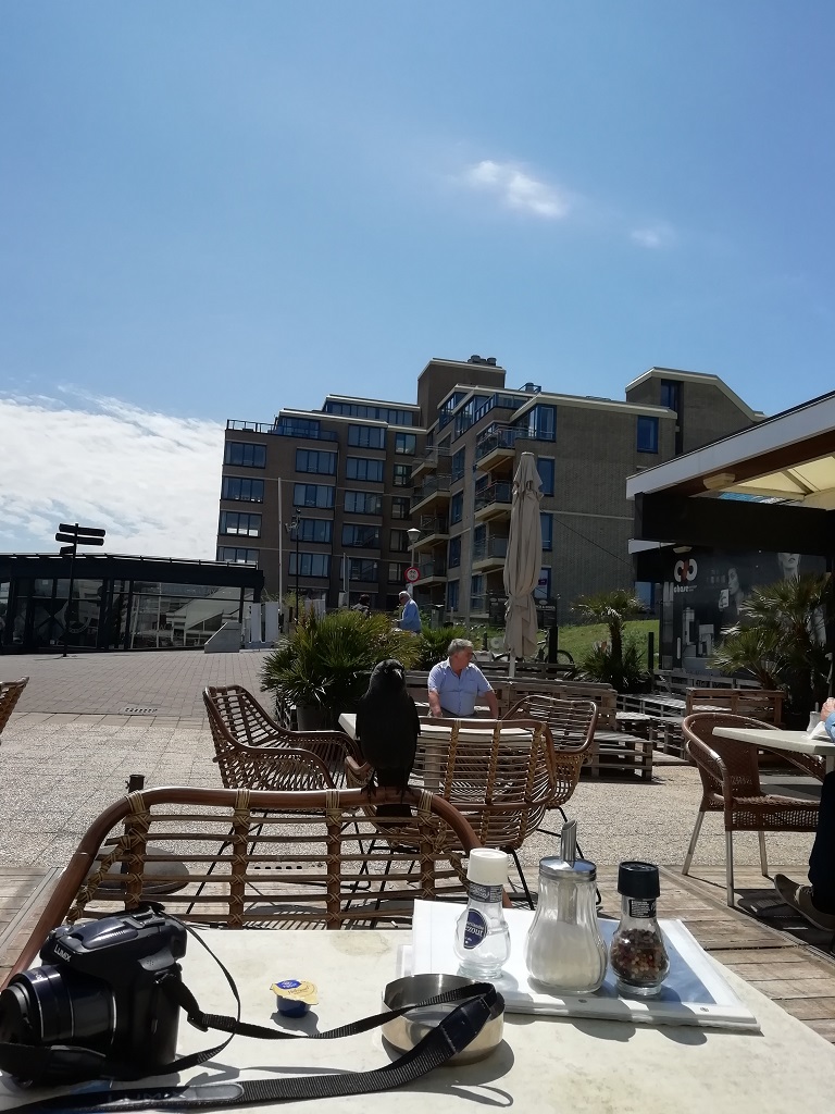 Den nächsten Tag beginnen wir mit einem Spaziergang. Vom Platz zum Strand und weiter durch die Dünen nach Kijkduin zur Einkaufspassage (Winkelpromenade). Die Passage hat zwar ihre besten Zeiten hinter sich, aber das Café am Eingang präsentiert uns einen schmackhaften Pfannkuchen. Da stört auch der hungrige Beobachter auf dem Stuhl gegenüber nicht.
