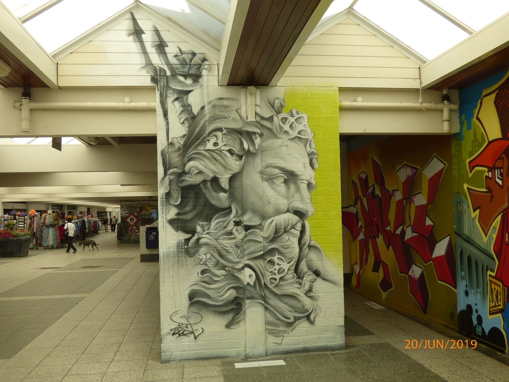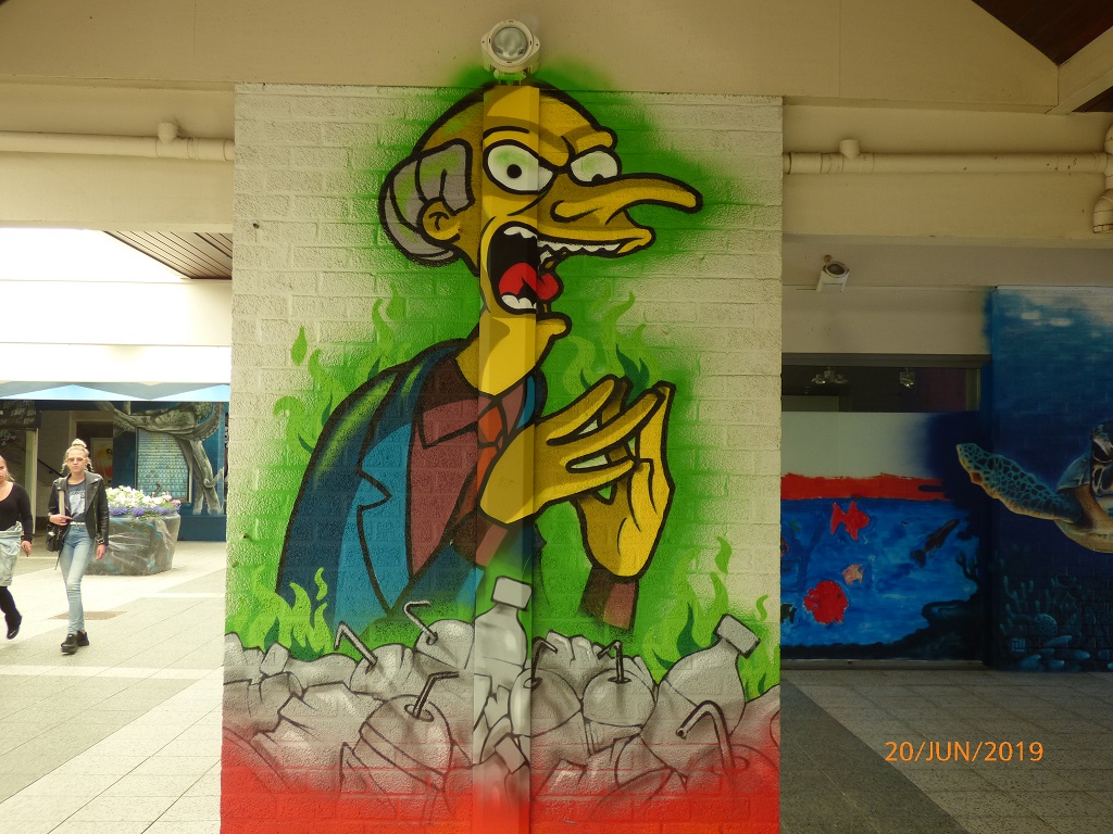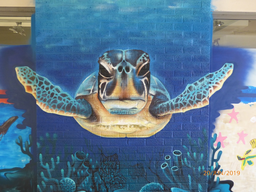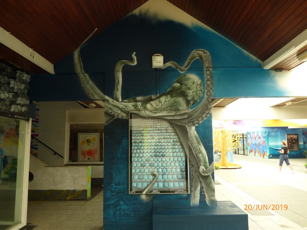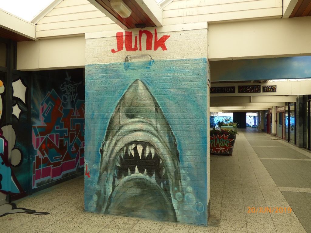 Die Läden im unteren Bereich sind leer, aber die Wände präsentieren eine sehr interessante Sammlung von Airbrush-Kunstwerken als Mahnung gegen die Verschmutzung der Meere durch Plastikabfall.