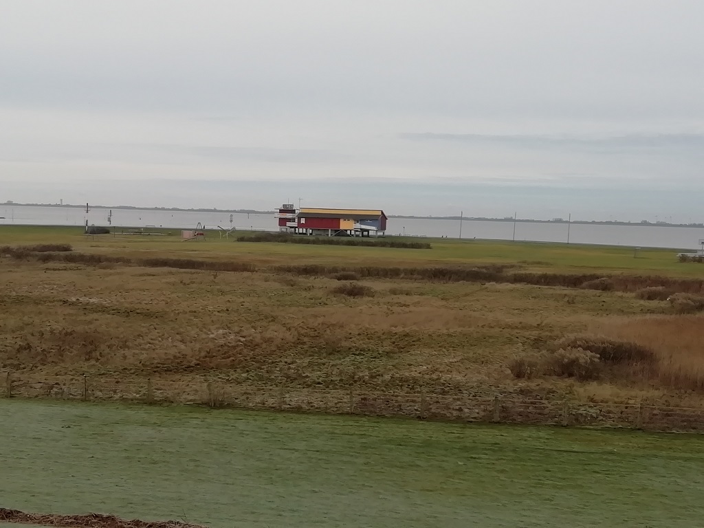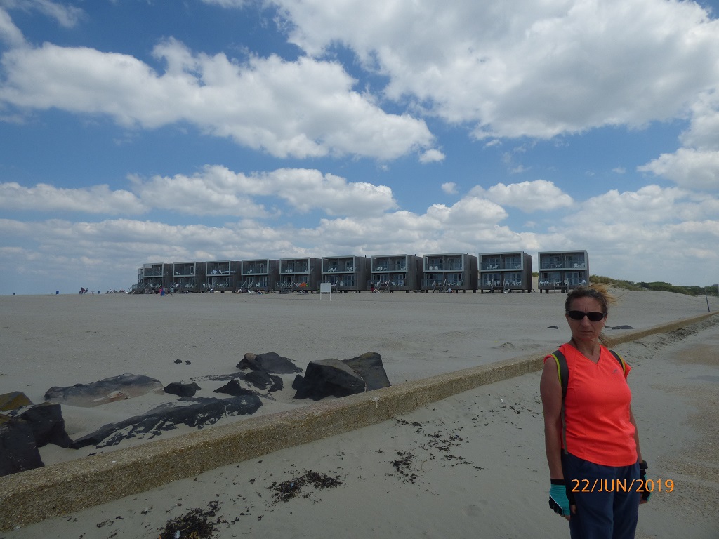 Es wird doch sehr windig und kühl je näher wir der Mündung kommen. Bis zur neuen Ferienhaus Anlage schaffen wir es noch gegen Wind und Sand, aber dann geben wir auf. Auf der Terrasse des Pier, übrigens ein umfunktionierter Bunker, lassen wir uns dann eine Cola mit Pommes schmecken.