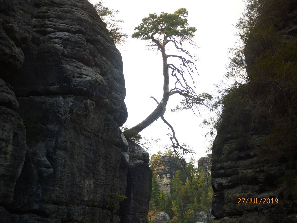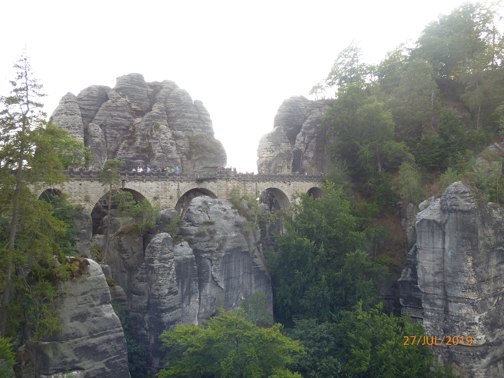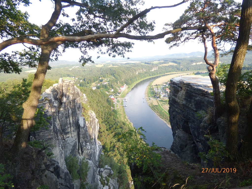 Nächster Halt ist die sächsische Schweiz. Schon das eine oder andere Mal als Ziel ausgegeben sind wir bisher immer am Wetter oder aber auch am Zeitplan gescheitert. Der Bildschirmschoner vom Computer hat die Neugierde geweckt. Den Standort des Fotografen entdecken wir vom Parkplatz kommend beim betreten des Rundweges zur Basteibrücke. Tolle imposante Steingebilde, aber auch imponierende Handwerkskunst die Brücke als auch die Reste der Felsenburg betreffend. Leichte Gänsehaut ist angesagt beim Beobachten der Klettermaxen gegenüber. Auch der Blick auf die Elbe ist atemberaubend.