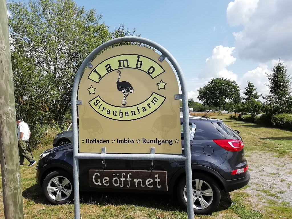 Wegen des ausgedehnten Frühstückes kommen wir heute nicht weit. Den Wohnmobilstellplatz in Luckau nutzen wir für die Übernachtung. Den Abend nutzen wir nochmals mit der Suche nach einer Straußenfarm in der Nähe von Luckau. Tatsächlich finden wir die Jambo Straußenfarm und die ist nur 9 Kilometer entfernt. Nach dem Frühstück geht es weiter. Die Hinweistafel am Parkplatz beruhigt ungemein. Ich liebe es wenn ein Plan aufgeht. Am Parkplatz werden wir von einer kleinen Abordnung der Farmbewohner empfangen. Den guten Abschluss bildet dann für jeden ein hervorragendes Filetstück des hier heimischen Laufvogels.