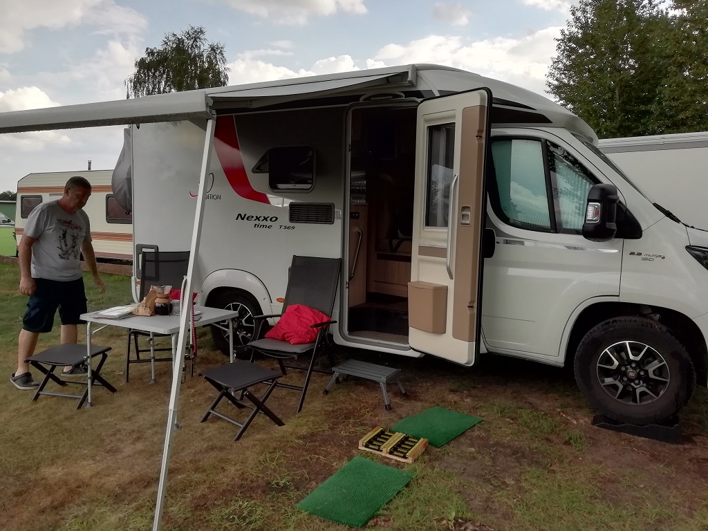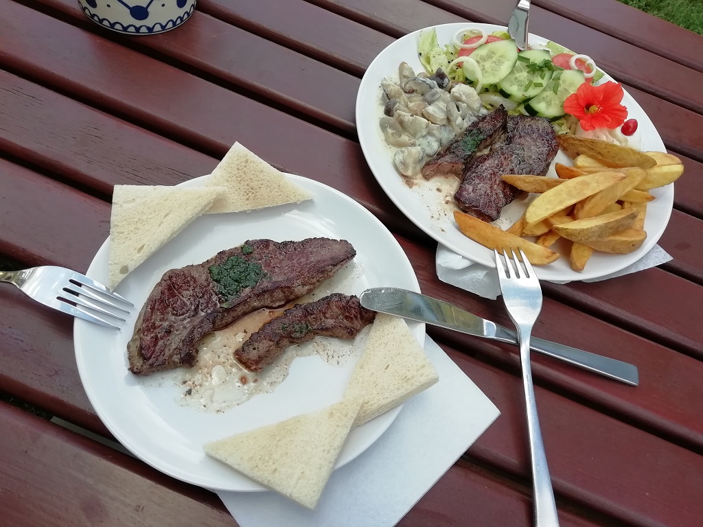 Es wird spät, aber wir kommen gerade noch rechtzeitig. Die Rezeption des Campingplatz „Entenfarm“ in Hohnstein wird extra wegen uns nochmal geöffnet. Eine Übernachtung und ein Frühstück später sind wir schon wieder auf der Bahn in Richtung Senftenberg. Unsere Freunde sind unter die Kleingärtner gegangen und haben sich einen Schrebergarten mit „Datsche“ zugelegt. Schönes Grundstück, direkt am See, der ist allerdings derzeit gesperrt. Insgesamt gibt es wohl Probleme mit absinkenden Uferböschungen bei den künstlich angelegten Seen. Die Datsche bietet sogar Wasser und Strom, sodass wir uns bei Kaffee und Kuchen angeregt unterhalten können. Abends gibt es lecker Essen beim „Stadl-Senftenberg“. Wirklich empfehlenswert, vor allem der Alm-Salat Ziegenkäse…. Wir dürfen Pompui im großen Hof abstellen. Schöner ruhiger Platz zum Übernachten. Aber auch ein sicheres Plätzchen da wir ja die nächsten Tage mit den Rädern unterwegs sein wollen. Man wird während unserer Abwesenheit ein Auge drauf haben. Wir berichten davon auf der „sportlichen Seite“. Für Ungeduldige…. hier lesen….