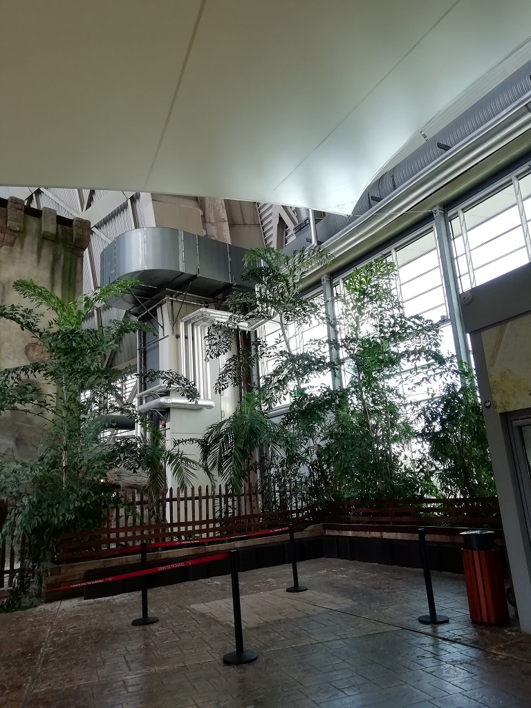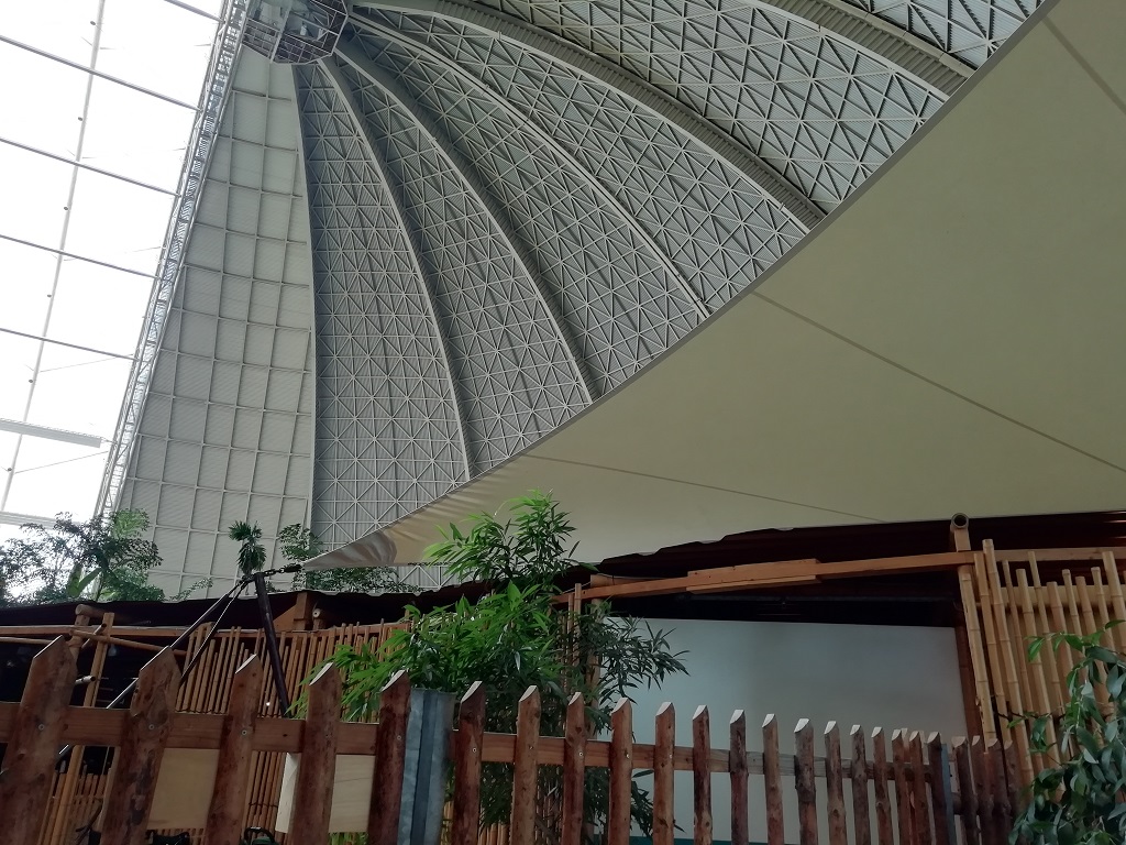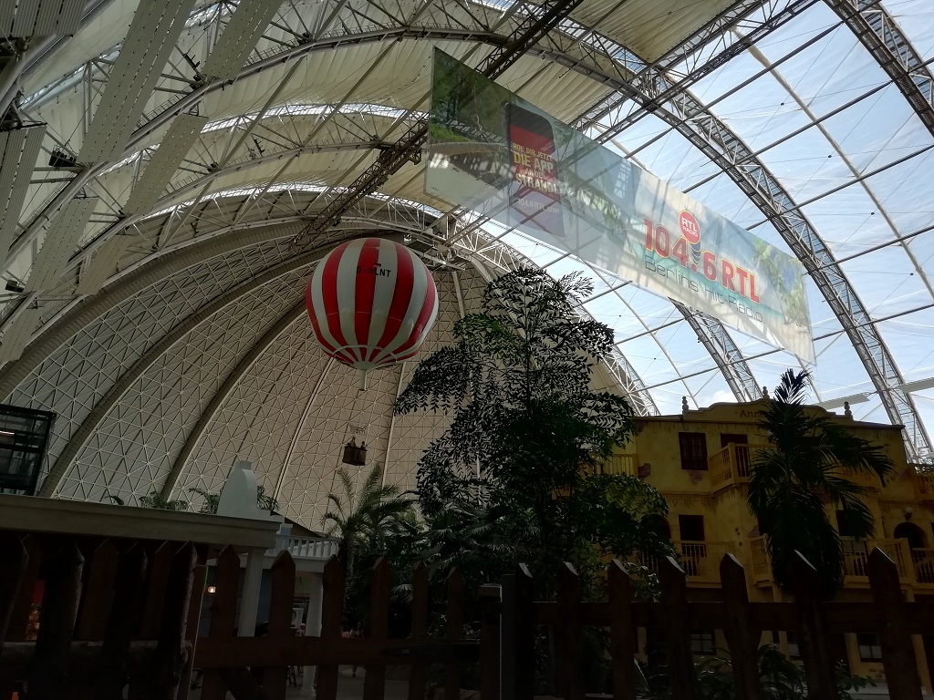 Die grobe Richtung, Berlin, ist vorgegeben. Deshalb sagen wir jetzt dem Spreewald ade, ohne richtig dort gewesen zu sein. Vom Parkplatz der Straußenfarm kann man tatsächlich die Kuppel des „Tropical Island“ sehen. Da es irgendwie auf dem Weg liegt schauen wir uns das imposante „Hallenbad“ an. Mir ist noch in Erinnerung, dass dies einmal die Cargo-Lifter Werfthalle war. Zu meinen Zeiten beim Bundesinnenministerium Anfang der 2000er wurde das Angebot der Firma geprüft für den Bund Zeppeline oder Ballons zum Frachttransport zu produzieren. Meines Wissens wurde damals in Ermangelung an Einsatzmöglichkeiten und wegen der bereits vorhandenen Frachtkapazitäten nicht verhandelt. Jetzt hat man die weltgrößte freitragende Halle zu einem riesigen Tropenhaus umgebaut. Wenn wir schon mal hier sind schauen wir auch mal rein.