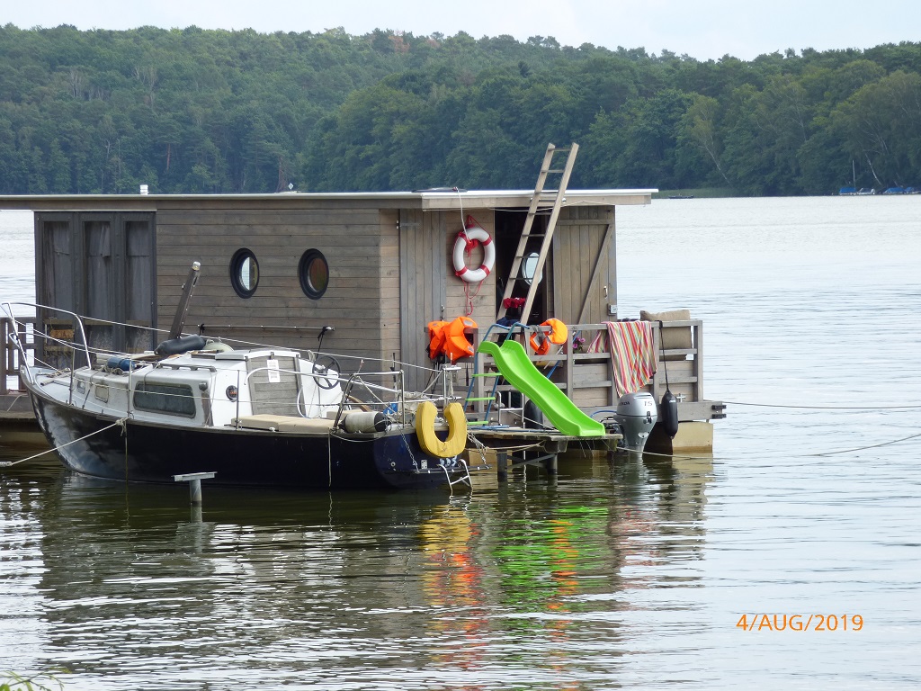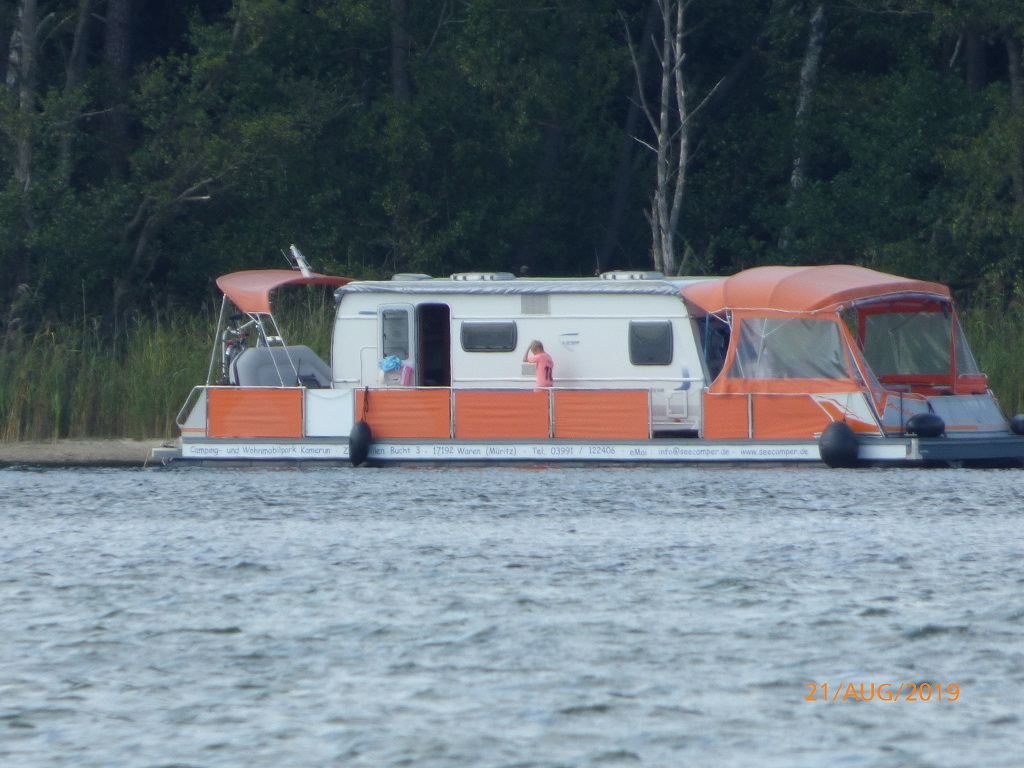 Als Ziel für die letzte Radtour des Urlaubs suchen wir uns das Wisent-Reservat in Jabel aus. Zum Tagesabschluss noch ein Blick über den See. Dabei fällt der Blick auf ein ganz besonderes Gefährt. Eine ganz spezielle Art des Hausbootes…. Das gibt es auch für Wohnmobile, aber nix für uns da ich bei dem geringsten Wellengang schon seekrank werde.