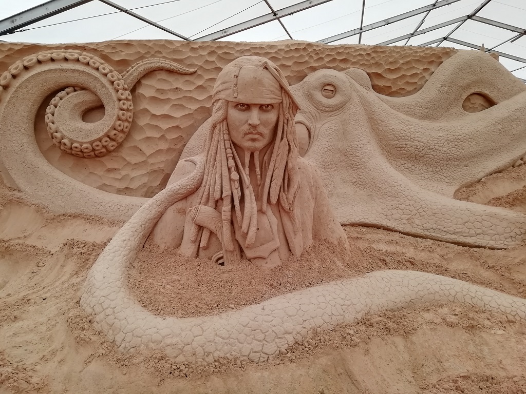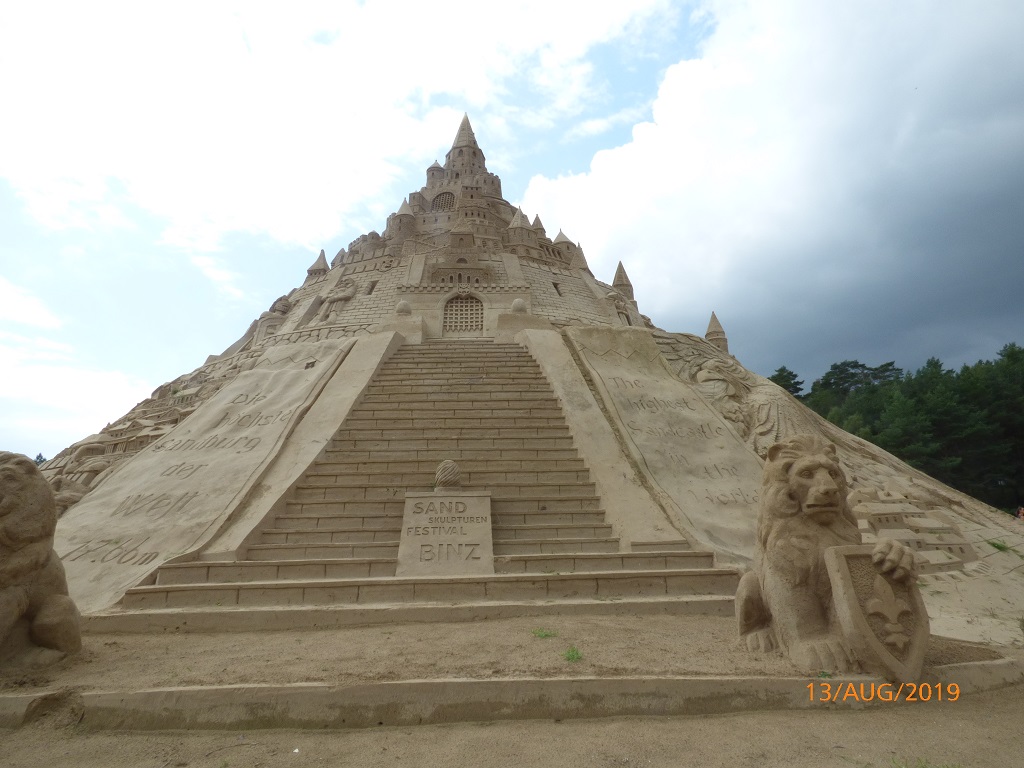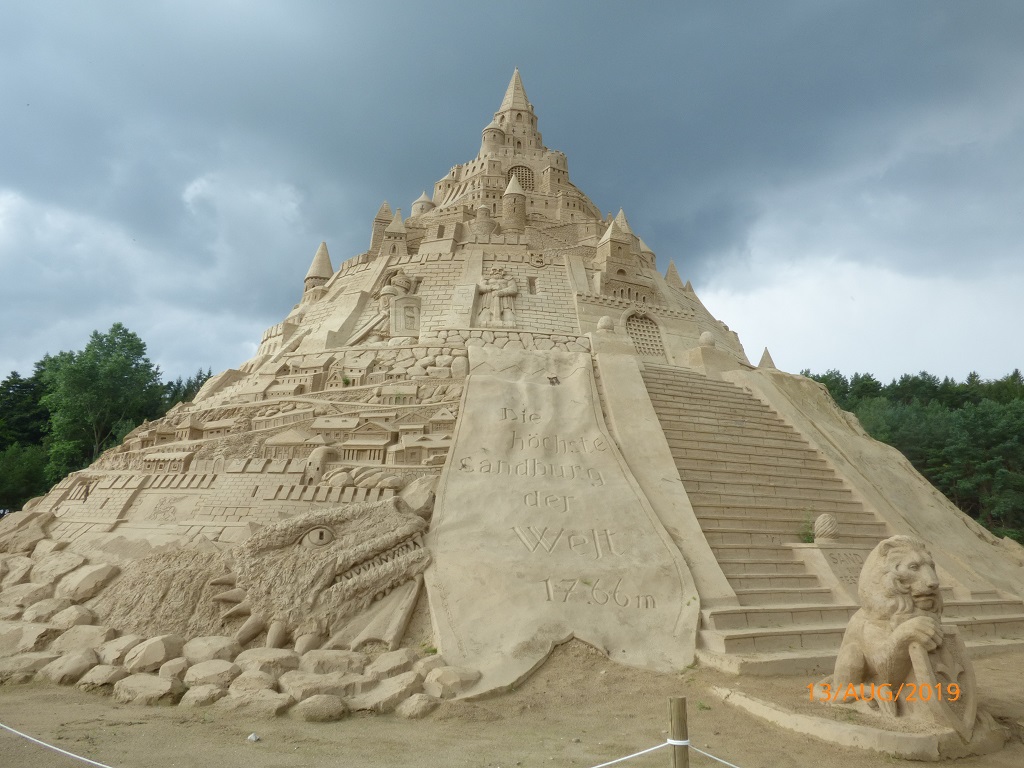 Unverhofft kommt oft! Auf der verregneten Rückfahrt entdecken wir die Werbung für das Sandskulpturen Festival von Binz. Zur Feier des 10 jährigen Jubiläums ist die höchste Sandburg der Welt errichtet worden. Diese Ankündigung und der Hinweis, dass die Sandfiguren zum Schutz vor Witterung im Zelt aufgebaut sind, hat uns die Entscheidung zur Pause sehr leicht gemacht…. Hier ein paar Beispiele der sandigen Kunstwerke: