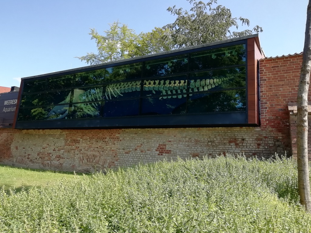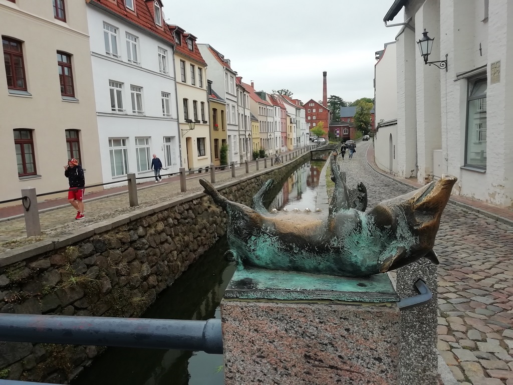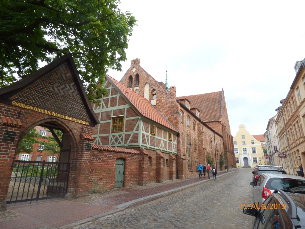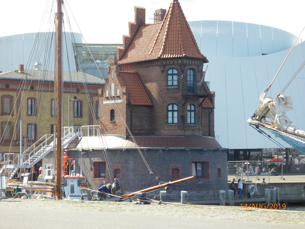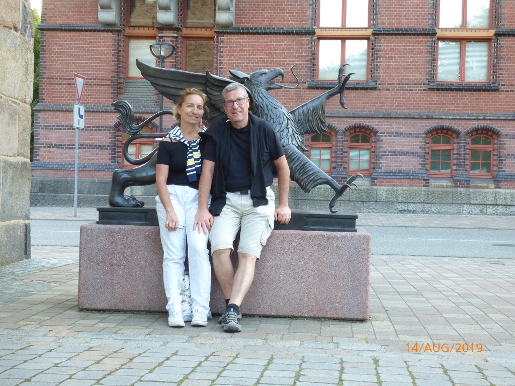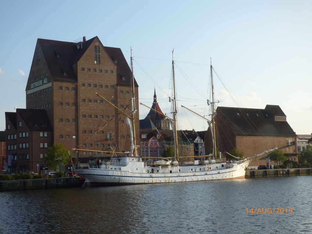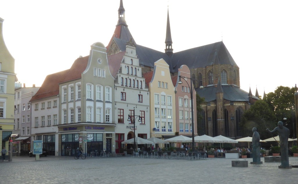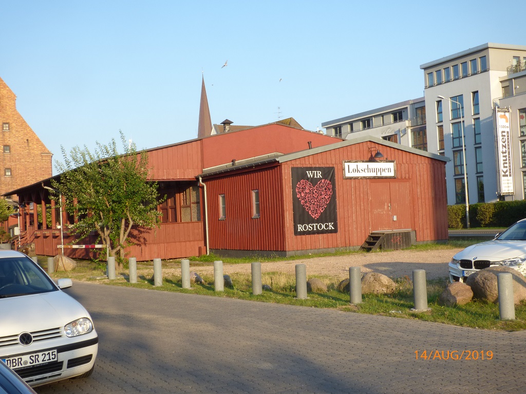 Es geht weiter nach Rostock. Via Internet suchen wir uns den Wohnmobilstellplatz Mühlendamm aus. Nur kurzes Einparken, Parkschein ziehen und dann nochmals ein Spaziergang in die Stadt. Auf der anderen Seite des Flusses Warnow sehen wir zunächst ein Beispiel für die Mehrfachnutzung einer Kirche. Dann einige markante Bauwerke in der Innenstadt. Am Rathaus zählt der Countdown bis zur Begehung der 600 Jahr Feier der Rostocker Uni. Nach dem Selfie vorm Wappentier geht es an der Stadtmauer entlang zum Hafen. Dort entdecken wir den Lokschuppen. Eine angesagte „Eventlocation“ die man für Festlichkeiten mit Catering anmieten kann.