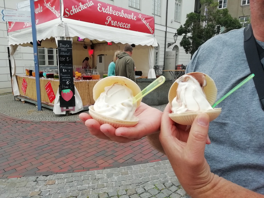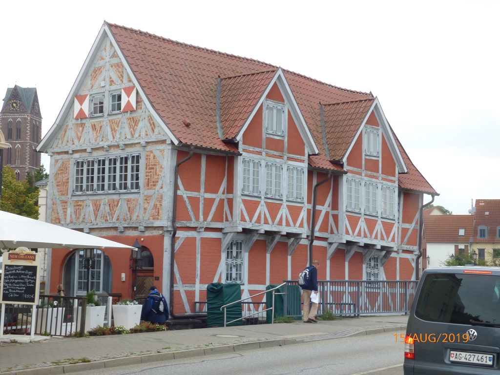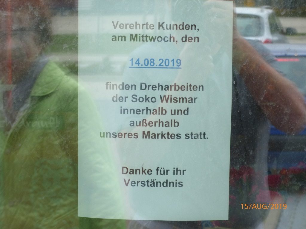 Am nächsten Morgen überredet uns die Polizei zu einer frühen Abreise. Die winken im Rahmen einer allgemeinen Verkehrskontrolle die Fahrzeuge auf den Platz und wir stehen im Weg. Gute Gelegenheit unsere Reise sofort in Richtung Wismar fortzusetzen. Die Suche nach einem Parkplatz endet auf dem Parkplatz des Supermarktes. Zur Tarnung gehen wir dort auch einkaufen und entdecken dabei einen Hinweis auf Dreharbeiten unserer Lieblings-Soko. Leider sind wir einen Tag zu spät dran. Wir kommen aber pünktlich zum Schwedenfest. Kleines Zitat aus der Internetseite „schwedenfest-wismar.de„: …, feiert unsere Hansestadt seit 20 Jahren immer im August das Schwedenfest – ein Fest, das zeigt, dass aus Besatzern Freunde wurden. Wismar war bis 1903 unter schwedischer Herrschaft. Heute pflegen und leben wir unsere Städtepartnerschaft mit der schwedischen Stadt Kalmar auf verschiedenen Ebenen. Und zu jedem Schwedenfest sind Menschen aus Kalmar unsere Gäste. Wir laufen über die Schweinebrücke zum Marktplatz. Dort probieren wir als Erstes DDR-Softeis in der traditionellen Waffelmuschel. Beim weiteren Rundgang entdecken wir noch einige Ecken die wir schon oft in den Szenen der Soko Wismar gesehen haben. Die Einfahrt zum Polizeirevier führt in Echt in den Innenhof der Heiligen-Geist-Kirche und ist sehr eng. Respekt für die Fahrer der Streifenwagen, die da teilweise sehr flott rein und raus fahren. Am Hafen eine weitere Sehenswürdigkeiten an der wir schon oft mit der Soko vorbeigefahren sind.