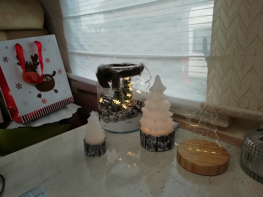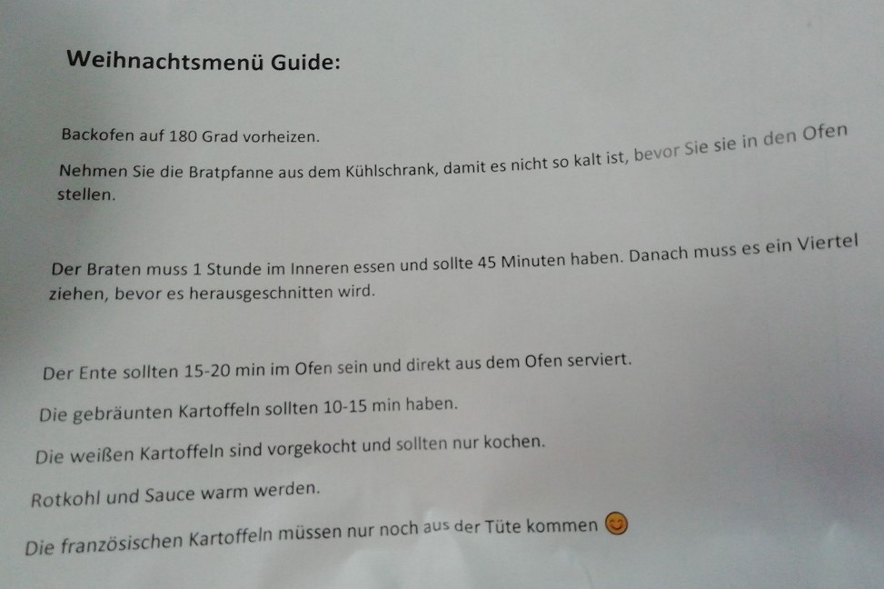 Dann ist endlich Heiligabend und der Baukasten fürs Abendessen wird geliefert. Der Campingplatz wartet mit einem Aufenthaltsraum auf der mit drei kompletten Küchenzeilen ausgestattet ist. Wir basteln nicht alleine in der Küche. Drei weitere Urlaubspärchen bereiten ebenfalls ihr Weihnachtsmenü zu. Daraus entsteht eine lange Essenstafel in der Essecke des Raumes. Die Geschenke packen wir danach aus.