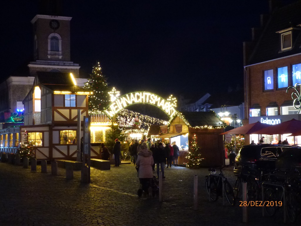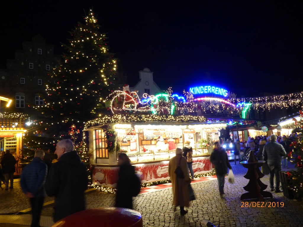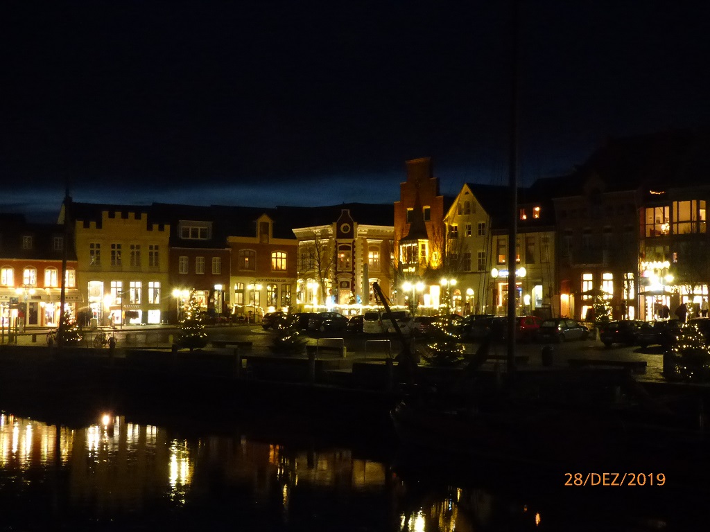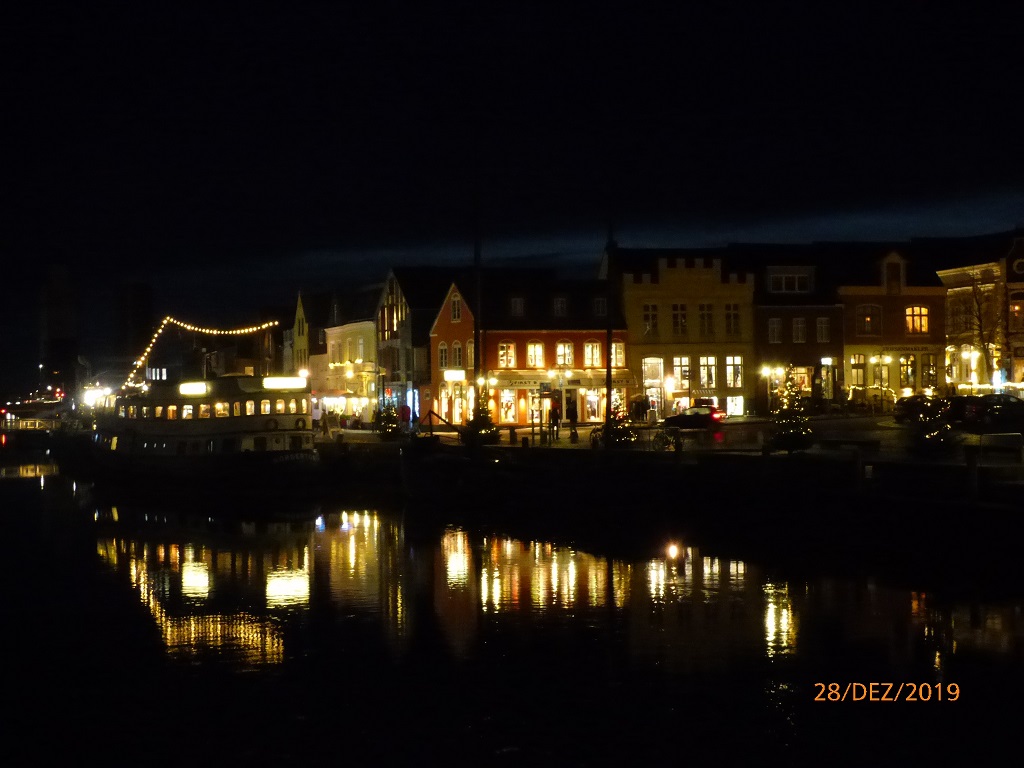Die nächste Etappe führt uns nach Husum. Kurzer Halt in Niebüll um die Vorräte aufzufüllen. Man sagt dies sei eine kleine, schnuckelige Stadt aber leider haben wir uns wieder einmal ein wenig verfahren und müssen dadurch aus Zeitgründen auf den Rundgang verzichten. In Husum haben wir zunächst Probleme den Campingplatz und danach den Betreiber, das Fischhaus Loof, zu finden. Alles wird gut und im Fischhaus kann man auch lecker essen. Beim abendlichen Verdauungsspaziergang schauen wir uns die festlich beleuchtete Innenstadt an. Der Spaziergang führt vorbei am Husumer Kinopalast. Die haben hier auf dem Gehweg eine Art Walk of fame gebaut. Auf den Pflastersteinen sind die Namen deutscher Filmgrößen mit Jahreszahl verewigt. Es ist nirgends eine Beschreibung zu finden, wir mutmaßen mal, dass hier wohl Hinweise auf frühere Kinopremieren platziert sind. Dem Schriftsteller Theodor Storm hat die Stadt Husum ein Hotel und sogar ein Museum in seinem Geburtshaus gewidmet.