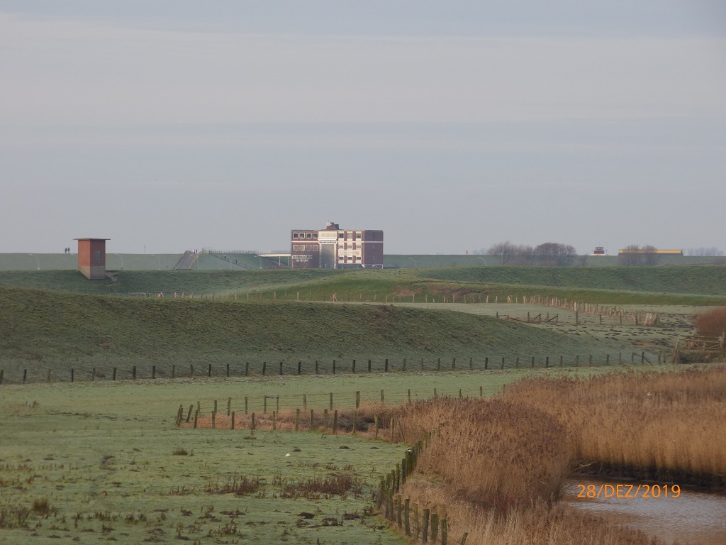 Die Bedeutung Wohnmobilhafen wird uns erst am nächsten Morgen bewusst. Alles sehr eng und improvisiert hier. Das Bild mit dem roten Pfeil zeigt den Platz und unser WoMo mittendrin. In die Die Toiletten sind nur über eine Chipkarte zu öffnen und die konnte man uns nicht geben, da nicht für jeden Stellplatz ein Chip vorhanden ist. Einige besonders rücksichtsvolle Camper haben entweder vergessen die Chipkarte abzugeben oder waren zu faul das Ding beim Fischhaus abzugeben…. Für uns gibt es keinen Chip mehr…. Für das Frühstück suchen wir uns ein nettes Café mit anständiger Toilette. An diesem Tag sind wir viel unterwegs. Zunächst eine ausgedehnte Wanderung an die Nordsee. Bisher haben wir es noch nicht geschafft die stürmische See zu beobachten, auch hier ist wieder einmal Ebbe. Ein Gebäude hat schon von Weitem unser Interesse geweckt. Das hat sich dann als Brandruine entpuppt und der Besitzer ist mit seiner Versicherung überhaupt nicht zufrieden. Der hat er hier ein Denkmal gesetzt…. Dann auch mehrfach den Weg zum Fischhaus bis wir endlich einen Zugangschip für das Toilettenhaus ergattern können. Die 50€ Pfand sind dem Verhalten der bereits genannten Camper geschuldet. Grundsätzlich nachvollziehbar, aber warum gibt es keine Chipkarte pro Stellplatz? Für den Pfand kann man vermutlich einige Ersatzkarten kaufen….
