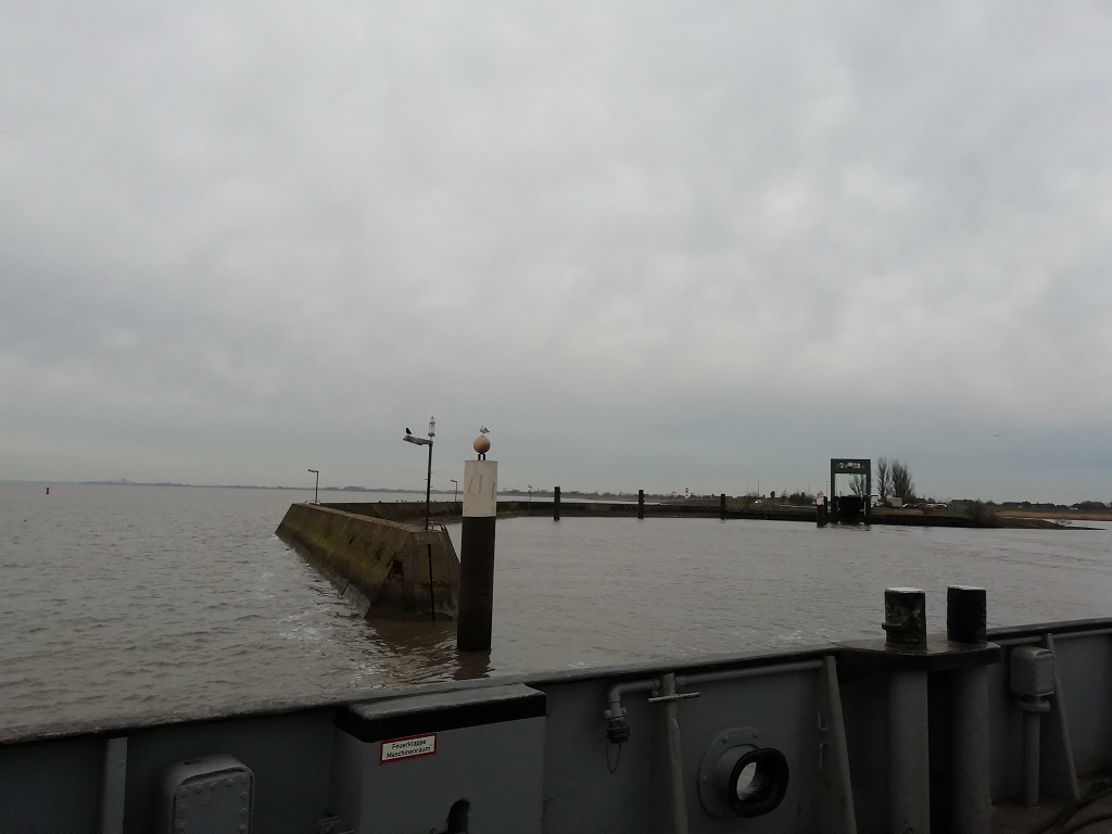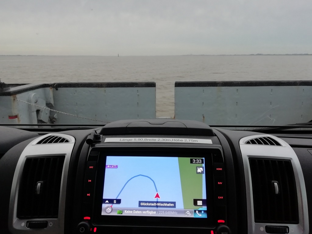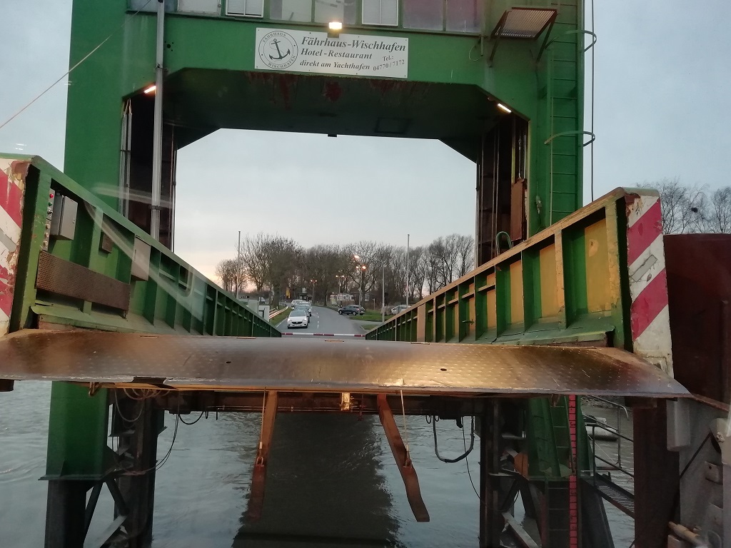 Danach fahren wir weiter zur Fähre in Glückstadt. An Bord ist es zwar bitterkalt, aber der Sonnenuntergang entschädigt für die kalten Ohren. Wir nehmen die Fähre als Abkürzung nach Cuxhaven. Den Umweg über Hamburg sparen wir uns.