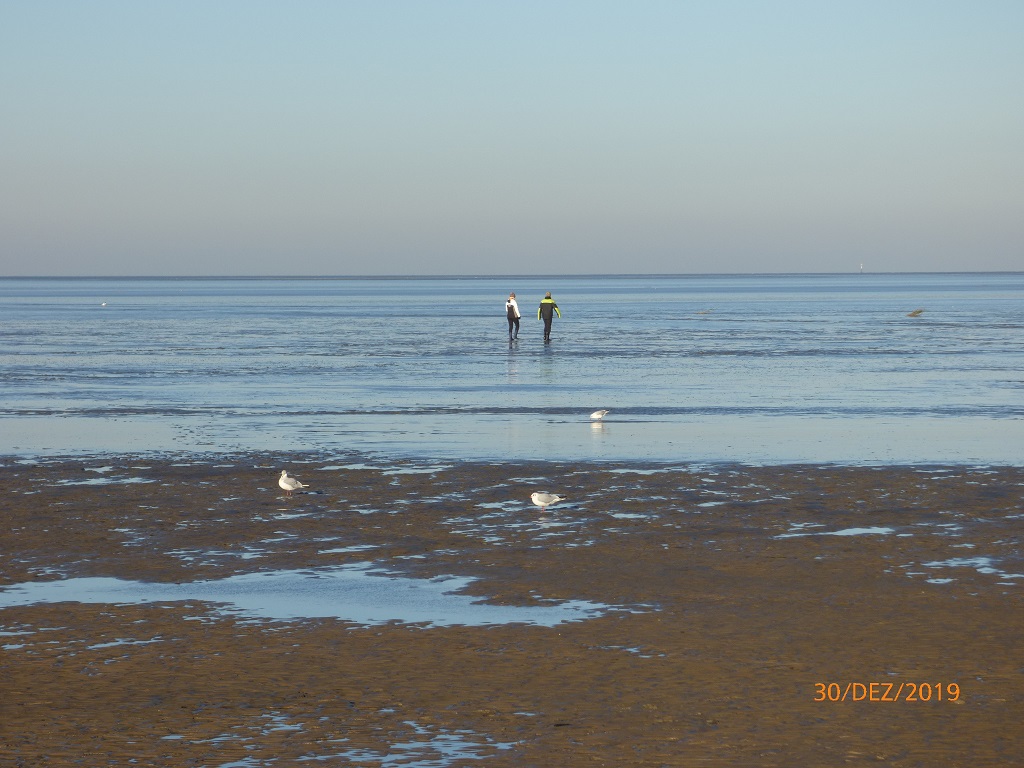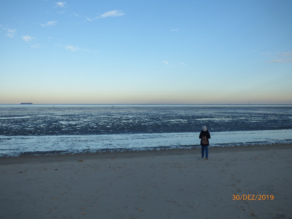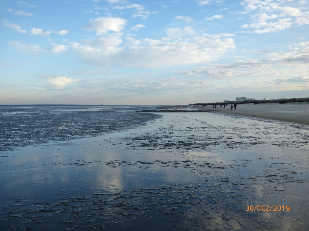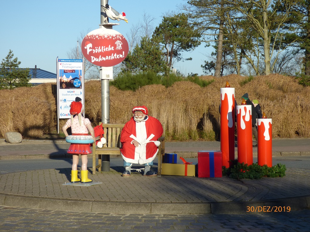Eigentlich soll der Camping-Nordsee in Cuxhaven-Duhnen der Ort für den Jahreswechsel werden, aber dort kann man uns nur eine Übernachtung anbieten. Über Sylvester ist der Platz ausgebucht…. Egal nach der erzwungenen Duschpause am Wohnmobilhafen Husum wollen wir endlich mal wieder richtige Körperpflege betreiben. Alles richtig gemacht, tolles Personal und sehr ansprechende Ausstattung der Anlage. Schade! Wir müssen hier wieder weg. Das Frühstück gönnen wir uns im Kiosk am Platz und tauschen unsere leere Gasflasche gegen eine Volle. Der Stellplatz muss pünktlich geräumt sein. Wir stellen Pompui vor der Einfahrt auf den Parkstreifen und machen uns auf die Suche nach der rauen Nordsee…. Schon wieder Pech gehabt! Schon wieder Ebbe! Das Nordsee Feeling mit starkem Wind und Sandkörnern im Gesicht ist trotzdem spürbar, auch wenn die Wellen und Schaumkronen irgendwie fehlen. Wir spazieren am Strand von Duhnen weg und an der Promenade wieder zurück. Dabei kommen wir auch an einem besonders ausgestatteten Kreisverkehr vorbei.