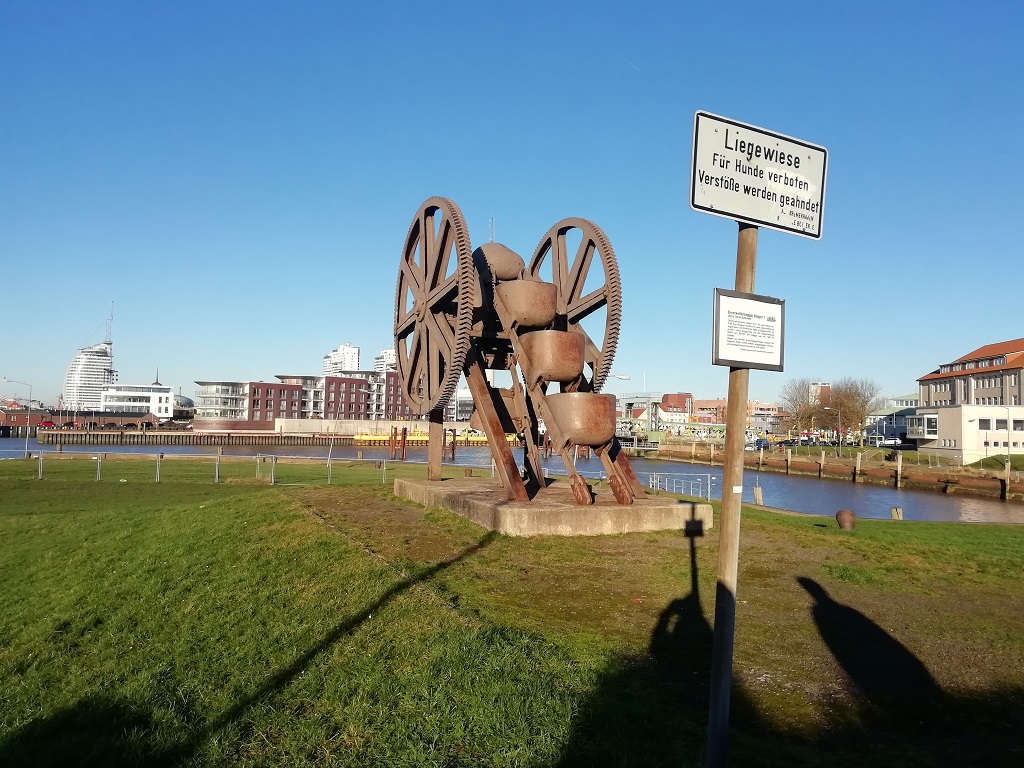 Von Duhnen aus geht es zunächst nach Bremerhaven, dort wollen wir uns noch einmal die so genannte maritime Meile anschauen. Der letzte Besuch war leider von schlechtem Wetter begleitet und da hat Sightseeing keinen Spaß gemacht…. Heute ist prachtvolles Wetter und das lockt sehr viele Besucher an. Außerdem macht Pompui seinem Namen alle Ehre, es gibt keinen passenden Parkplatz. Wir weichen auf einen Randbezirk aus und laufen einfach mal los. Vom Fischereihafen aus sehen wir die markanten Gebäude der maritimen Meile. Das ist dann doch zu weit, zumal wir noch einen Campingplatz ausfindig machen müssen. Auf dem Rückweg zum Dicken finden wir nicht nur zwei gepimpte Garagentore sondern auch eine richtig gute Eisdiele. Im Eiscafe Mavelli stöbern wir im Internet nach freien Plätzen in der Gegend um Bremerhaven, aber im Gegensatz zu unserem Eisdealer sind die meisten von November bis März geschlossen oder ausgebucht.