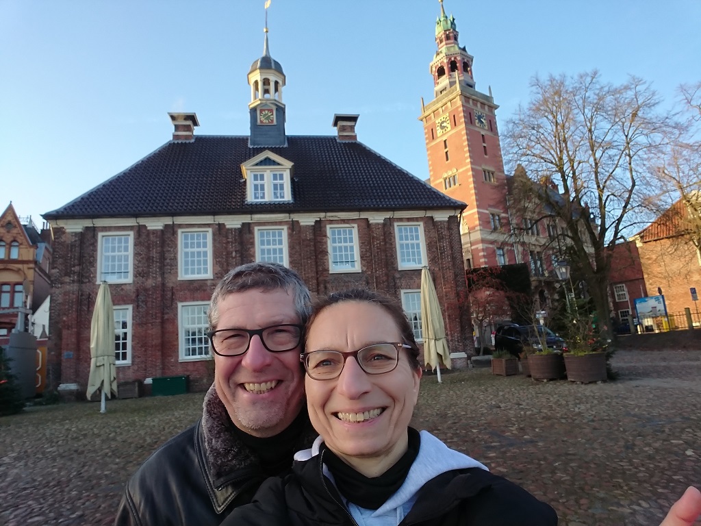 Zurück im Schneckenhaus schauen wir auf die analoge Karte und suchen uns die Stadt Leer an der Ems aus. Ein Anruf bei „Ems-Marina-Camping“ genügt und wir haben einen Stellplatz bis ins nächste Jahr sicher…. Dadurch ist die Weiterfahrt auch deutlich entspannter. Wir werden sehr nett empfangen, testen die neue Kaffeemaschine in der Rezeption und bestellen gleich die Frühstücksbrötchen. Aufgrund der angenehmen Atmosphäre buchen wir uns gleich für vier Übernachtungen ein.