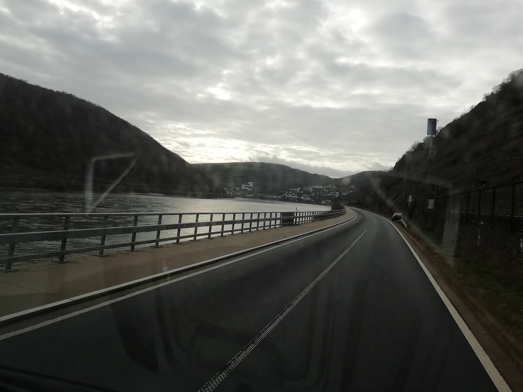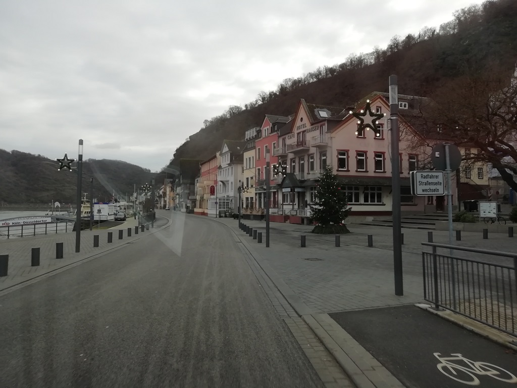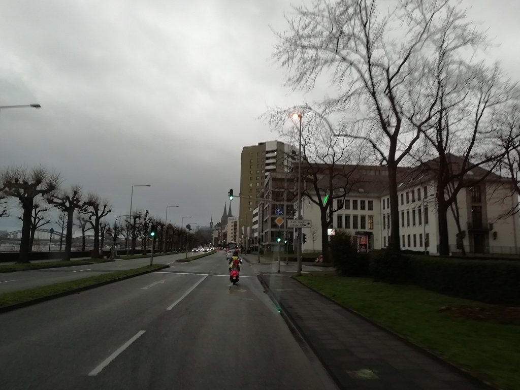 Der Heimweg soll uns am Rhein entlang führen. In Köln folge ich dem Schild „zur B9“ die führt nämlich direkt am Rheinufer entlang. Zunächst die Irrfahrt durch Köln und in einem Vorort passiert es dann. Die Straßen werden immer schmaler und als ich einem Audi Q7 ausweiche erwische ich den Außenspiegel eines VW-Bulli….