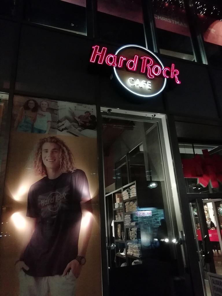 Der abendliche Spaziergang führt uns am geschlossenen Weihnachtsmarkt, einem Bekleidungsgeschäft für Jecken und dem Hardrock Café vorbei. Da müssen wir natürlich rein, ein T-Shirt kaufen und bei guter Musik noch einen Kaffee trinken.