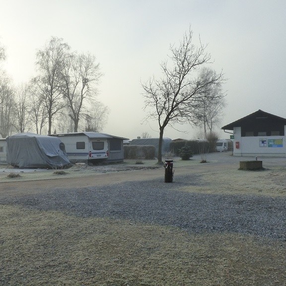 Die Rezeption ist zwar schon geschlossen, aber wir haben per Mail entsprechende Infos erhalten. Schnell einrichten und das Schneckenhaus aufheizen, denn ohne Sonne wird es empfindlich kalt… Kleiner Tipp am Rande! Vor der Tour genau die Gasflaschen prüfen!! Ich war mir so sicher, dass wir von der letzten Tour noch eine volle Flasche haben. Typischer Fall von Denkste. Wieder einmal! Beide Flaschen bringen beim Start der Heizung nur die blöde Fehlermeldung. Es folgt eine hektische Stunde. Im Nachbarort Kolbermoor bei einer Fritz Berger Filiale können wir noch kurz vor Feierabend die beiden leeren gegen volle Flaschen tauschen. Wieder zurück am Platz klappt es auch mit der Heizung… Der Campingplatz am Erlensee ist morgens steif gefroren aber nach dem Frühstück sieht es um einiges freundlicher aus.