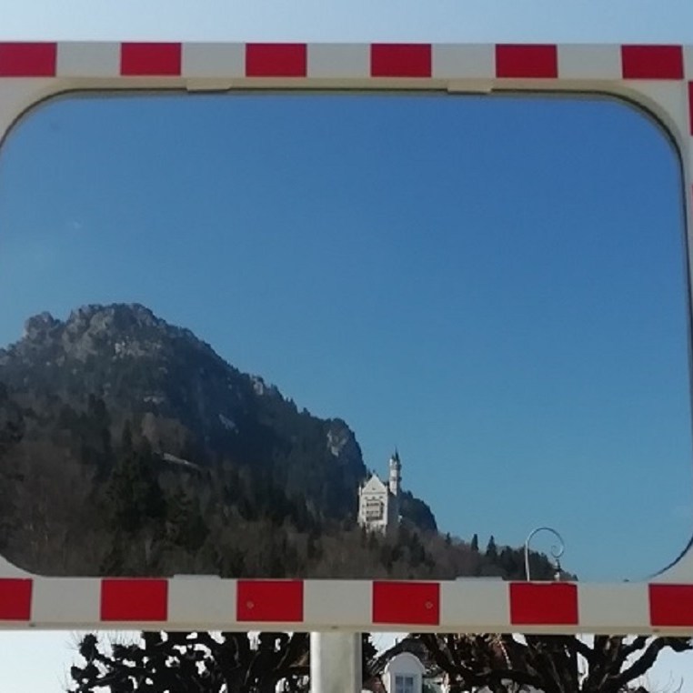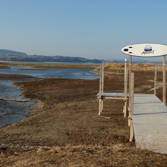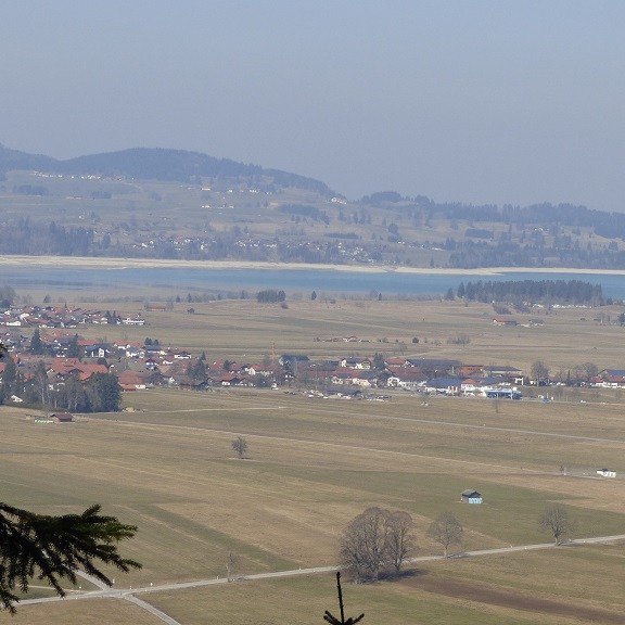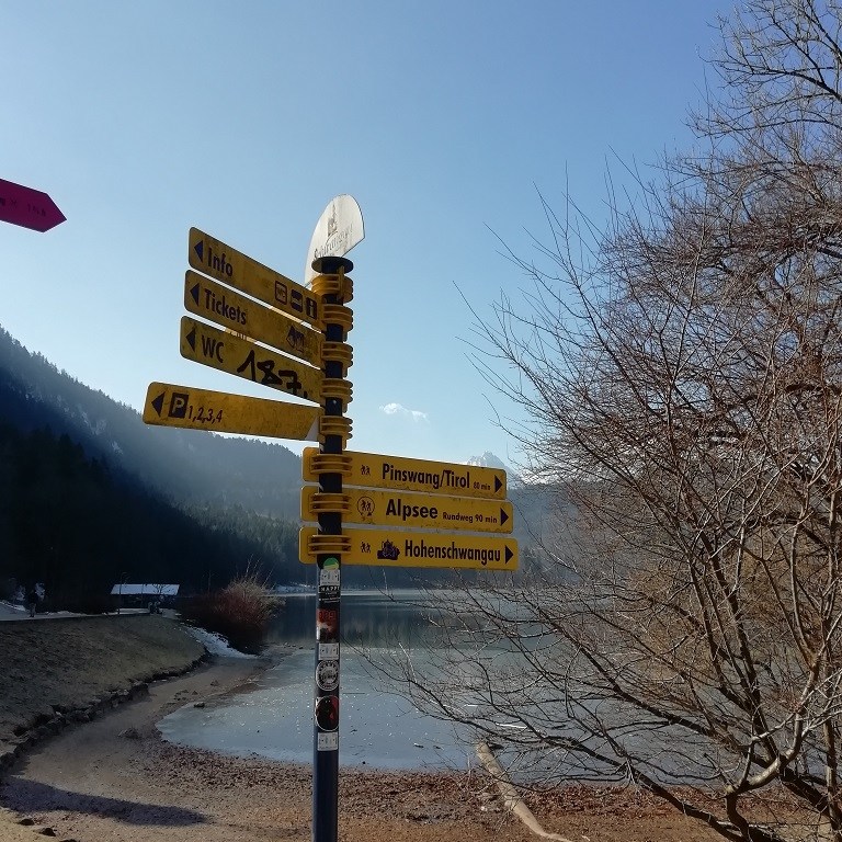 Bei der Suche nach dem Forggensee werden wir durch eine Infotafel darauf hingewiesen, dass wir einfach zu früh dran sind um den See zu erleben… Der See wird in den Wintermonaten abgelassen und hat erst im Juni wieder seinen Höchststand. Die Hinweistafel für Badegäste kommt einem dabei recht seltsam vor…. Wie nahe Brunnen an Neuschwanstein liegt lässt ein Blick durch den Kamerasucher erahnen…