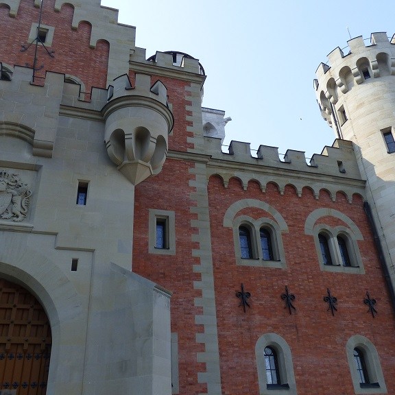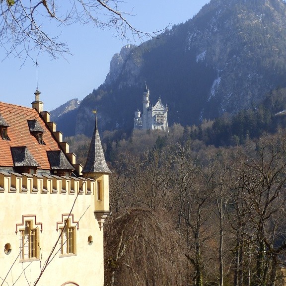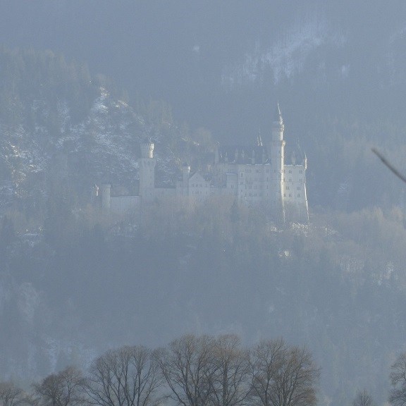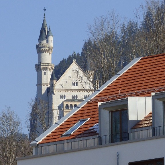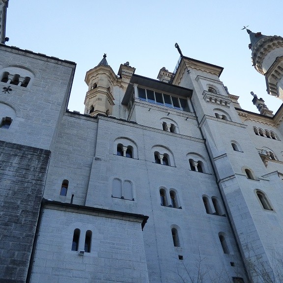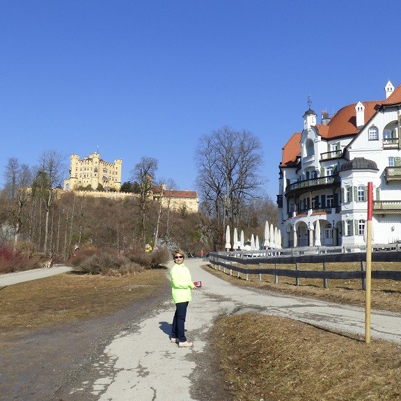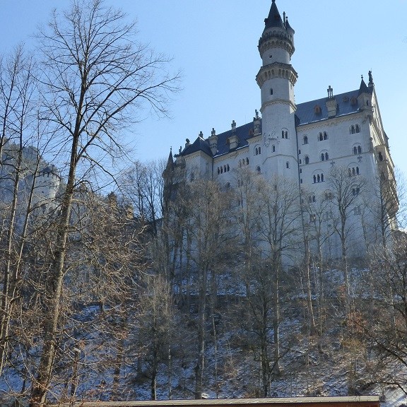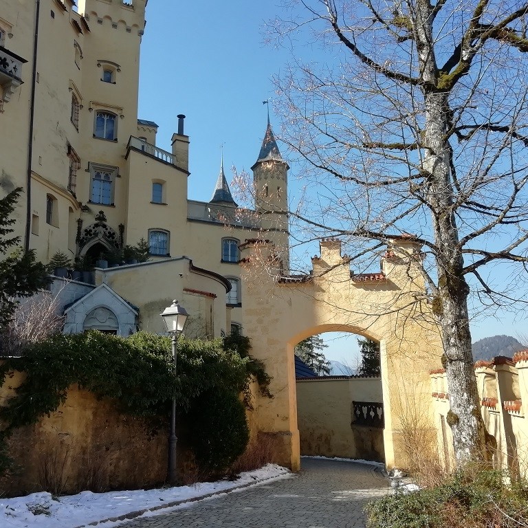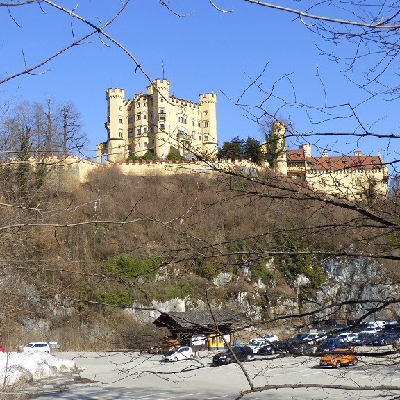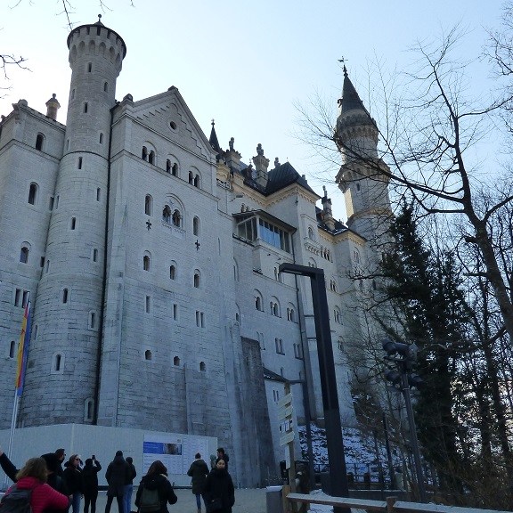 Wir verzichten dann doch auf die Führung durch Neuschwanstein. Am Einlass werden wir darauf hingewiesen, dass derzeit eine Wartezeit bis mindestens 15:00 Uhr besteht. Das wird uns zu spät denn die Rückfahrt soll noch in der Nachmittagssonne erfolgen, damit wir uns nicht die Nasen abfrieren. Der Blick von unten macht aber neugierig und wir spazieren doch nach oben um alles aus der Nähe und von außen anzuschauen.