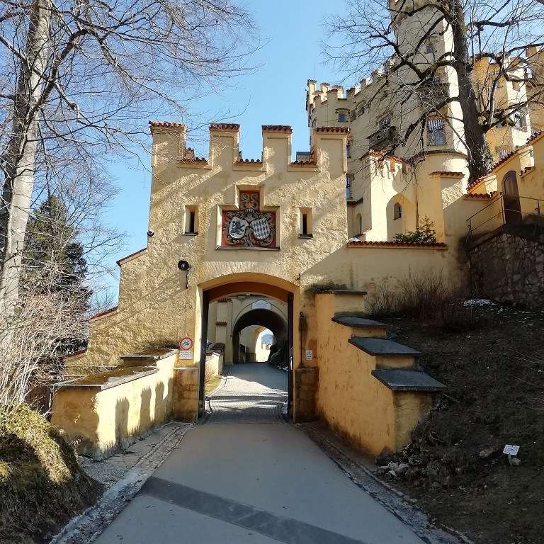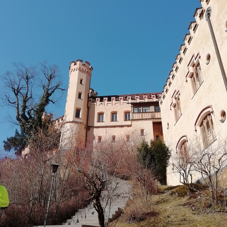 Vom Alpsee aus erklimmen wir den Anstieg zum Schloss Hohenschwangau. Von hier oben führt eine Treppe am Bauwerk entlang nach unten zum Parkplatz, dem Museum und dem Ticketverkauf.