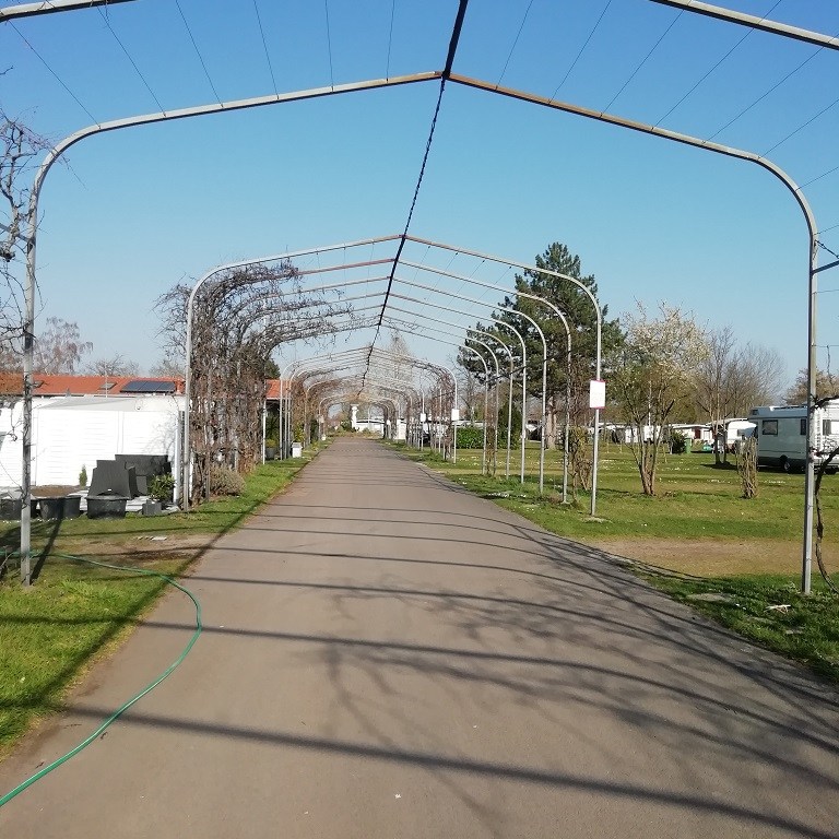 Aus dem Buch „Wann…. Wohin“ entnehmen wir den Tipp für die Mandelblütenzeit in Rheinland Pfalz. Dazu suchen wir uns den Knaus Campingpark in Bad Dürkheim aus. Die Hinfahrt führt über den Rhein und mitten durch Weingärten. Das Gasthaus Almensee liegt in direkter Nachbarschaft und links davon ist die Einfahrt des Campingparks. Die Anlage ist eine Art Lehrpfad für Weinsorten. Der Hauptweg zu den Stellplätzen ist wie ein Bogengang angelegt. An dessen Metallbögen ranken die Weinreben nach oben und teilweise auch darüber hinweg. Sieht ohne Blattwerk der Reben schon imposant aus. Die Einfahrten zu den Stellplätzen sind jeweils nach Rebsorten benannt. Links vom Bogengang sind die Dauercamper angesiedelt und der Kreis um die Statue bildet die Wendeplatte am Ende des Tunnels / der Straße / des Platzes.