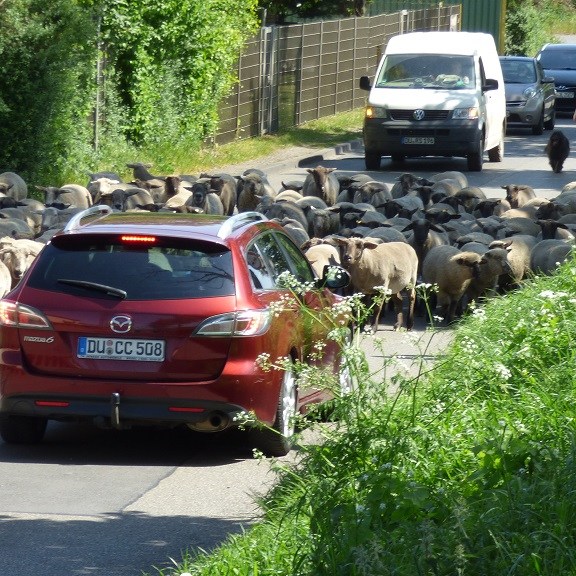 Das neue Kaffeegeschirr muss natürlich eingeweiht werden bevor es mit den Rädern nach Duisburg geht. Den direkten Einstieg zum Radweg am Kanal entlang verpassen wir natürlich und irren daher in den Randgebieten von Oberhausen herum. Nach der Überquerung der Schleuse geht es dann um einiges entspannter. Am Kanal entlang begegnet uns auch eines der Frachtschiffe aus der Schleuse wieder. Richtig gemütlich wird es bei der Einfahrt zum Industriehafen, denn die vierbeinigen Rasenmäher sind nach getaner Arbeit auf den Uferbefestigungen auf dem Heimweg…