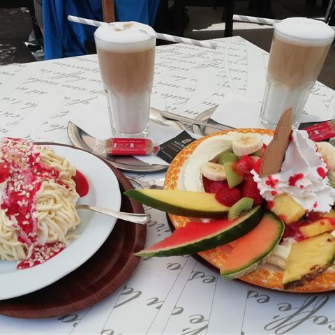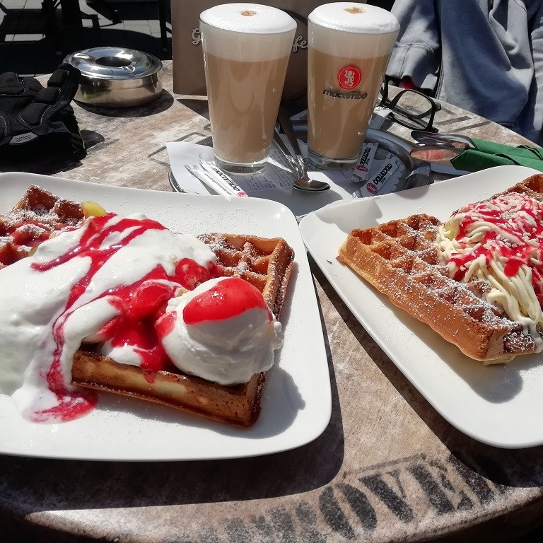 In der Fußgängerzone gibt es die wohlverdiente Belohnung. Das obligatorische Gedeck ist leicht abgeändert. Das Spaghetti Eis wird auf Waffel serviert. Wir schauen voraus und essen Gehaltvolles wegen der langen Rückfahrt 😉 Noch ein paar Aufnahmen aus der Innenstadt und auf dem Rückweg noch ein kleiner, beabsichtigter, Umweg in den Innenhafen.