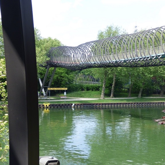 Montag, 09. Mai: Shopping Time im CentrO wir gehen auf Tour um noch ein paar Kleinigkeiten zu besorgen. Der Vertreter des LEGO Star Wars Imperiums ist natürlich nicht gemeint. Der passt nur in ein Schaufenster… Nach dem Einkauf wollen wir unser Glück beim Gasometer versuchen. Beim ersten Versuch im Januar 2019 war wegen der Weihnachtsferien geschlossen. Derzeit wird die Ausstellung „zerbrechliches Paradies“ gezeigt. Schon beim Spaziergang dorthin hat mich eine Vorahnung beschlichen und die Bestätigung bekommen wir durch die geschlossene Kasse. Ein zufällig anwesender Mitarbeiter erklärt uns, dass der Gasometer, wie jedes Museum in Oberhausen, Montags geschlossen hat. Wir sollen doch morgen wieder kommen… Der hat gut reden… Dann rät er uns zu einem Spaziergang zum Kaisergarten. Dort umkreisen wir den kleinen Bruder und laufen auf der Metallspirale in Richtung anderes Ufer. Nach ein paar verwirrenden Windungen verzichten wir, bleiben auf der richtigen Seite für unseren Rückweg zur Marina.