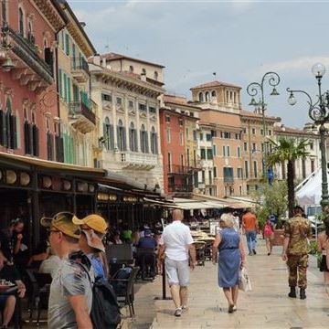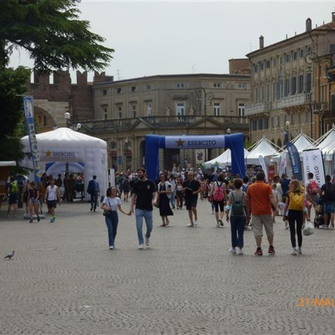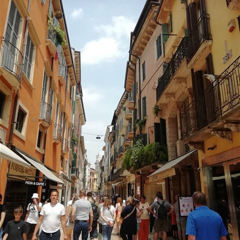 Sonntag, 22. Juni: Heute lassen wir die Räder dann doch am Platz, denn in der Stadt ist es durch die Veranstaltung einfach zu eng und zu voll. Laut Google sind es knapp fünf Kilometer Fußmarsch. Es geht an der Straße entlang bis zu einem neu angelegten Park ganz in der Nähe der Messe. Vorbei an den alten Messegebäuden kommen wir wieder in die Innenstadt. Ohne die Räder wagen wir uns auch durch die engeren Gassen. Sogar den legendären Balkon von Romeo und Julia schauen wir uns an. Der Ansturm auf den Innenhof ist uns aber zu heftig und wir bleiben in sicherer Entfernung.