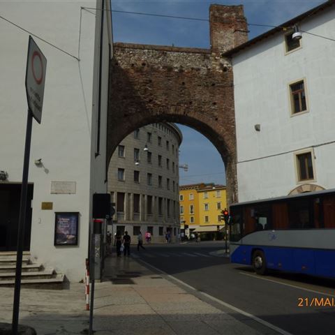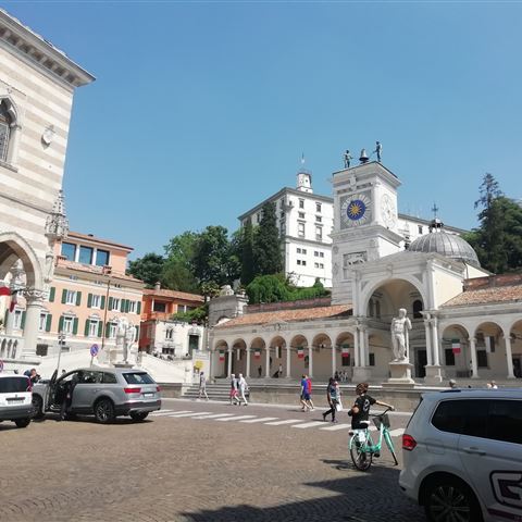 Elli sucht und findet über das Handy einen Wohnmobilstellplatz in Udine. Eine erstklassige Übernachtungsmöglichkeit. Ein großer Parkplatz mit Parkscheinautomat, der 6 € für 24 Stunden verlangt. Sogar eine Parkbucht ist als Entsorgungsstation für Abwasser und Toilette umfunktioniert. Ideale Voraussetzungen, die wir so nicht erwartet haben. Da die Innenstadt nicht weit entfernt ist lassen wir die Räder auf dem Heckträger und gehen zu Fuß. Ein kleiner Rundgang vor der Abfahrt nach Salzburg führt uns zum Piazza Liberta und von dort nach oben zum Udine Castle.