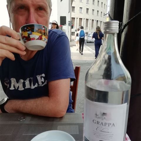 Die herzförmig gebackenen Pizzen schmecken prima und zum Espresso bekommt jeder ein Extra serviert. Für mich eine zwei Liter Flasche Grappa und für Elli eine Schale mit Sahne. Das Mischverhältnis dürfen wir eigenhändig bestimmen. Na ja der Grappa bleibt unberührt und die Sahne löffeln wir lieber pur.