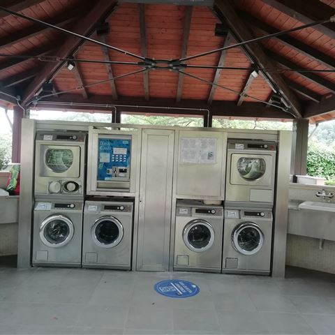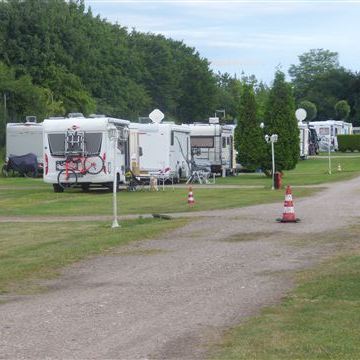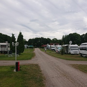 Dienstag, 21. Juni: Eine Rezeption gibt es nicht. Das Anmeldeformular mit Umschlag und Verhaltensregeln liegt bereit. Die linke Seite parkt mit der Schnauze in Richtung Zaun, die rechte Seite in Richtung Ausfahrt. Das Formular wird ausgefüllt und im Umschlag, zusammen mit dem errechneten Platzgeld, in den am Allzweckhaus angebrachten Briefkasten geworfen. Dort sind auch Einzeldusche und Toilette untergebracht (beide gegen Gebühr). Neben dem Haus ist ein kleiner Minigolfplatz versteckt. Die Installationen für Frischwasser sowie Abwasser- und Toilettenentsorgung sind vorm Haus bzw. beim riesigen Hinweisschild im Einfahrtsbereich erreichbar.