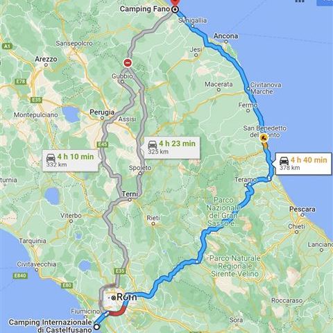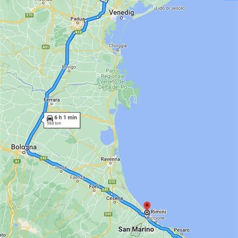 Durch den Zwischenstopp in Ostia drängt die Zeit, daher ist in Fano auch nur eine Übernachtung möglich. Schade, hier hätten wir es noch ein paar Tage ausgehalten. Es geht zunächst an der Küste entlang. Aus Neugier suchen wir uns Rimini für einen Zwischenstopp aus. Keine gute Idee, wir stehen im Stau stadteinwärts, die Promenade ist menschenleer und alle Geschäfte sind geschlossen. Die Kaffeepause fällt aus, denn auch hier steckt man noch voll in den Saisonvorbereitungen. Stadtauswärts kommt richtig Stress auf. Das Navi schickt uns nach rechts und wir stehen vor einer Bahnunterführung. Die Höhe wird mit 2,70 Meter angegeben. Auf unserem Armaturenbrett steht: Höhe: 2,75m! Elli steigt aus und dirigiert mich von der anderen Seite. Offensichtlich hat man hier eine gewisse Kulanz eingebaut, denn wir kommen ohne Dachberührung durch den kleinen Tunnel.
