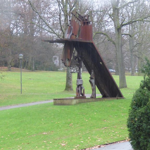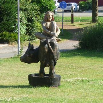 Dann ist es soweit. Pompui steht in der Werkstatt und ich schwinge mich auf meinen roten Renner. Frühstück bei der Bäckerei Derks im Café am Markt. Schon bei der Einfahrt in die Fußgängerzone ist mir eine seltsame Skulptur aufgefallen. Das will ich natürlich genauer untersuchen. Gestärkt mit zwei Tassen Kaffee und zwei Brötchen komme ich der Sache auf die Spur. In Kranenburg sind einige Künstler mit dem Motto „ein Spaziergang durch Kranenburg entlang des Unerwarteten“ unterwegs. Ich bin mit der Kamera dabei.