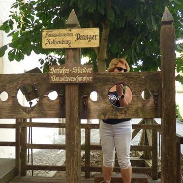 Donnerstag, 23. Juni: Rothenburg liegt einige Meter über dem Campingplatz. Es ist nicht weit in die Stadt, aber die Höhenmeter haben es in sich. Die Räder bleiben auf dem Heckträger. Die Stadt lässt sich einfacher zu Fuß erkunden. Nach dem mühsamen Aufstieg kühlen wir uns im mittelalterlichen Kriminalmuseum ab. Der am Galgen hängende Käfig hat unsere Neugier geweckt. Das Museum ist sein Geld wert. Sehr ausführliche Darstellung der Begebenheiten in Bezug auf die Gesetzgebung und Strafverfolgung im Mittelalter. Alles untermauert, dokumentiert durch originales Folterwerkzeug und Waffen.