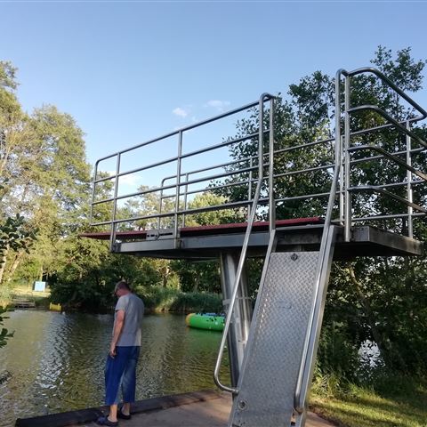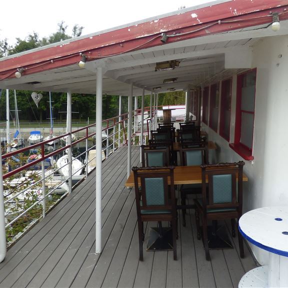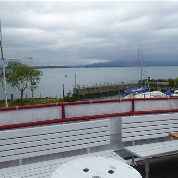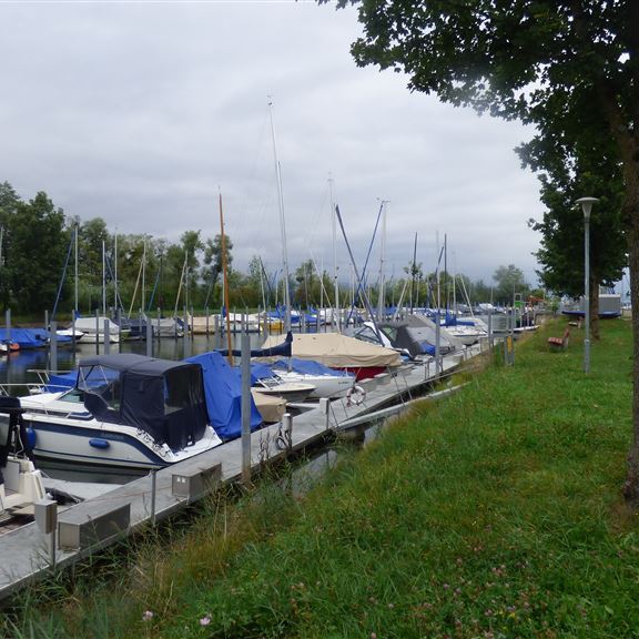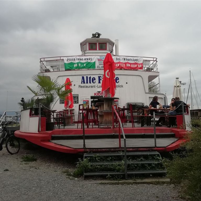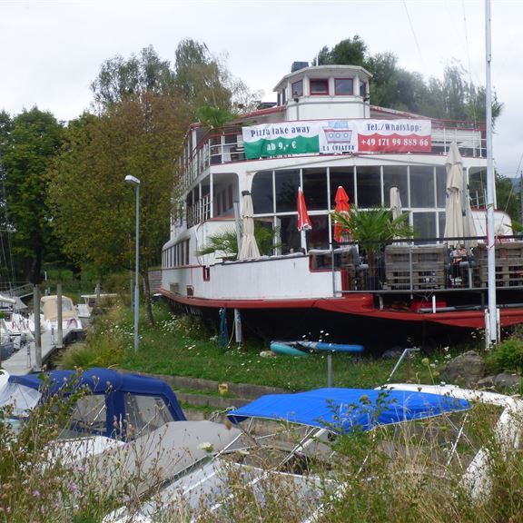 Samstag, 05.08.2022: Elli soll sich schonen, daher sind die Räder schon auf dem Heckträger. Es geht mit dem Bus bis zur Grenzsiedlung Zech und von dort laufen wir am See entlang nach Österreich, genauer nach Lochau. Im Yachthafen überrascht uns die Alte Fähre mit ihrem außergewöhnlichen Ankerplatz.