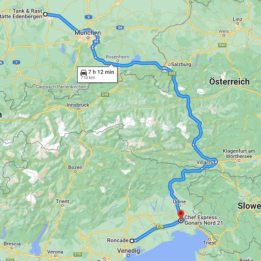 Donnerstag, 29. September: Nach der Arbeit geht es los und wir schaffen es bis zur Raststätte Edenbergen kurz vor Augsburg. Die Raststätte weckt Erinnerungen aus dem Jahr 2016. Wir stehen sogar auf dem gleichen Parkplatz wie damals. Neugierig? Zur Beschreibung von damals geht es hier lang…. Wir übernachten dieses Mal ohne böse Überraschung und fahren nach dem Frühstück trotz starkem Nebel gut gelaunt weiter. Wie gewohnt bessert sich das Wetter je weiter wir nach Süden kommen. In Roncade werden wir von herrlichem Wetter begrüßt und Dania hat einen tollen Stellplatz für uns.